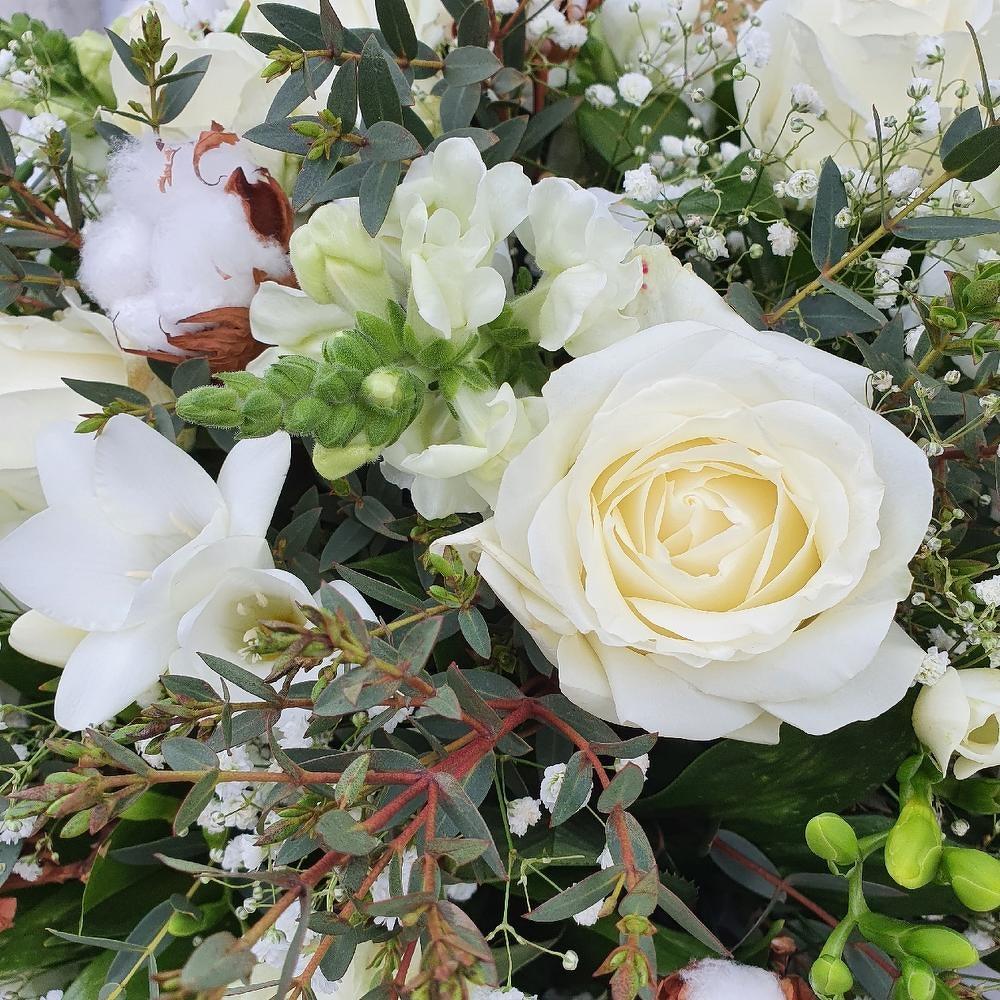Гипсофила – 4 шт.Эвкалипт – 5 шт.Зелень – 25 шт.Роза белая – 19 шт.Фрезия белая – 10 шт.Упаковка дизайнерская – 5 шт.Львиный зев – 10 шт.Птичка декоративная – 1 шт.Хлопок натуральный – 5 шт.