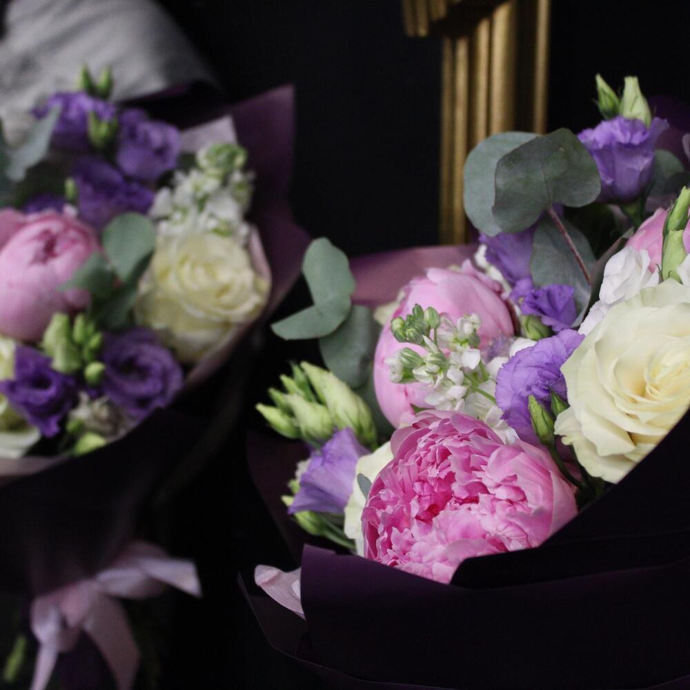 Эвкалипт – 1 шт.Тишью – 2 шт.Пион Сара Бернар – 3 шт.Роза Мондиаль – 3 шт.Маттиола белая – 2 шт.Пленка матовая – 2 шт.эустома белая – 1 шт.эустома лавандовая – 2 шт.