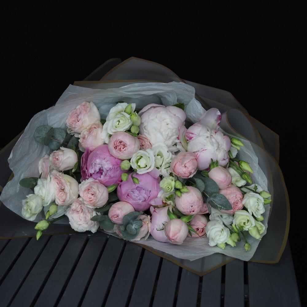 Пион Сара Бернар – 5 шт.роза кустовая пионовидная мэнсфилд парк – 4 шт.эустома розита вайт – 4 шт.Эвкалипт – 2 шт.Тишью белое – 2 шт.Пленка матовая – 2 шт.Лента атласная – 1 шт.