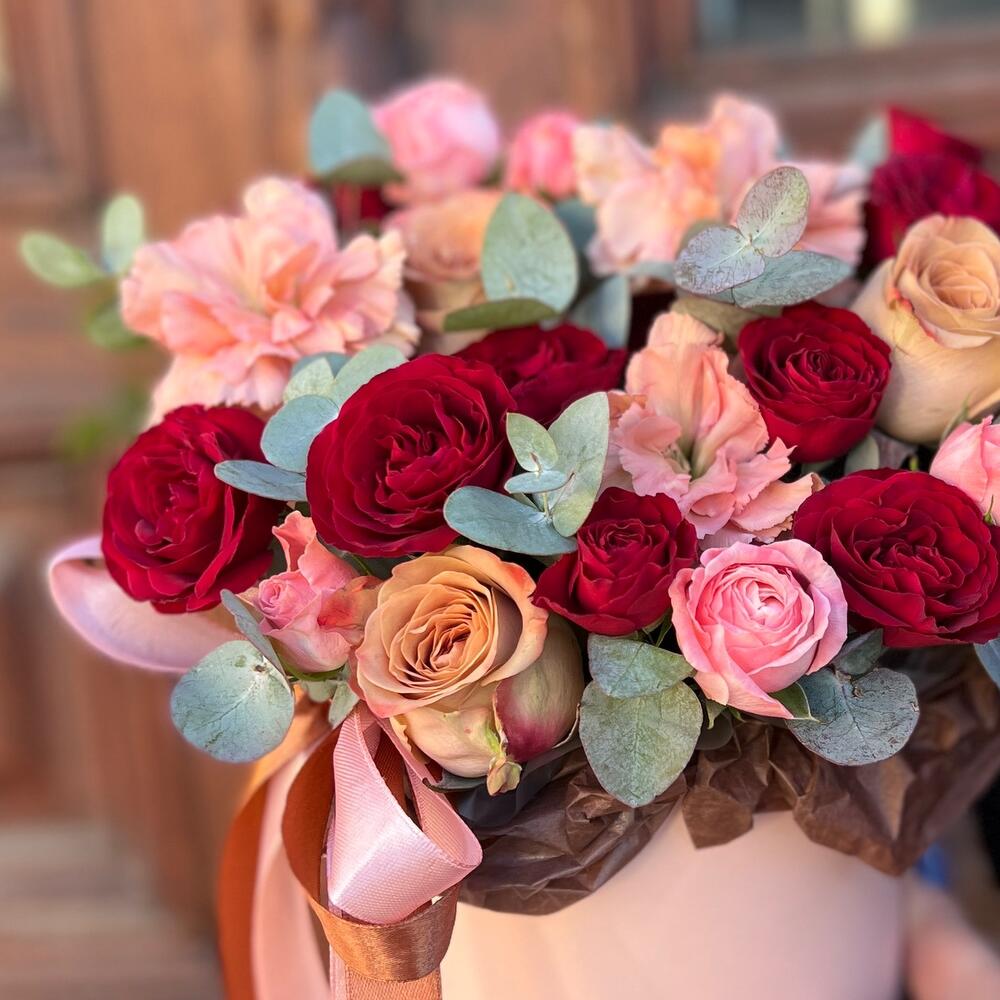 Роза Капучино – 3 шт.Эвкалипт – 3 шт.Лента атласная – 2 шт.Диантус – 3 шт.Коробка шляпная – 1 шт.Оазис флористический – 1 шт.роза кустовая мадам бомбастик – 1 шт.роза кустовая пионовидная ред трендсеттер – 2 шт.