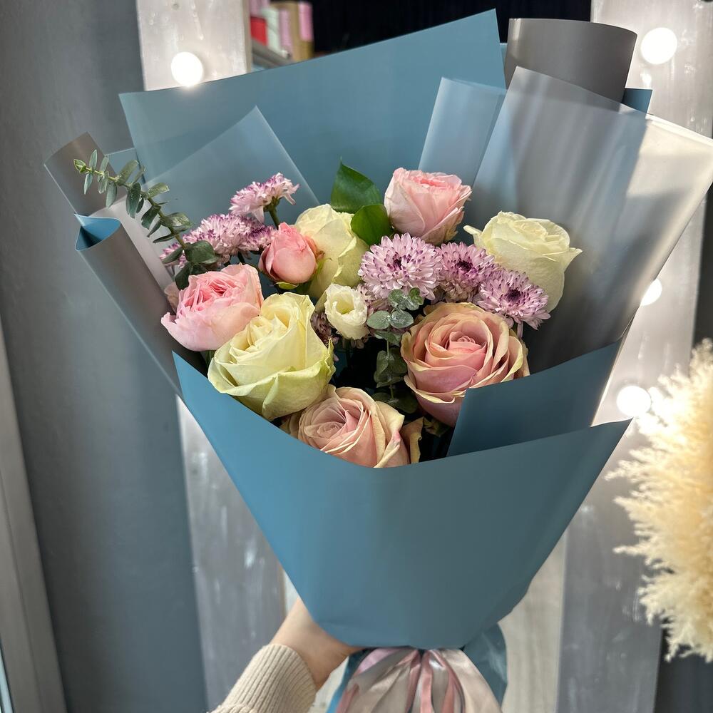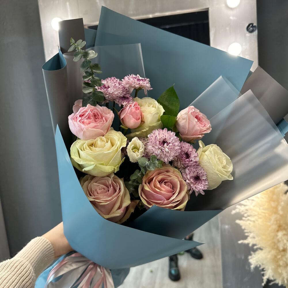 Роза – 5 шт.Сантини – 3 шт.Роза кустовая – 1 шт.Рускус – 1 шт.Эвкалипт – 2 шт.Упаковка дизайнерская – 4 шт.