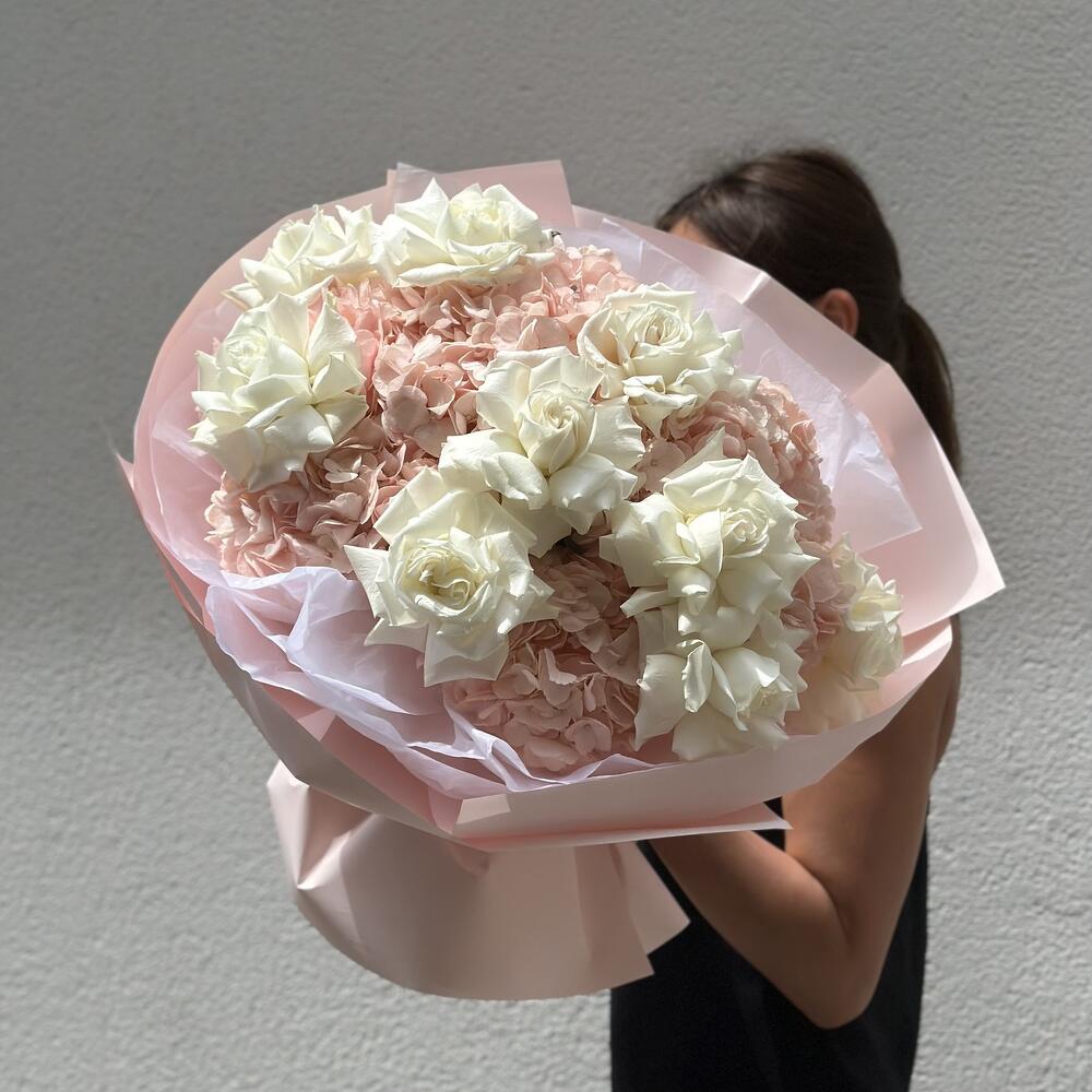 Кремово-клубничая композиция из нежнейших роз и гортензии.