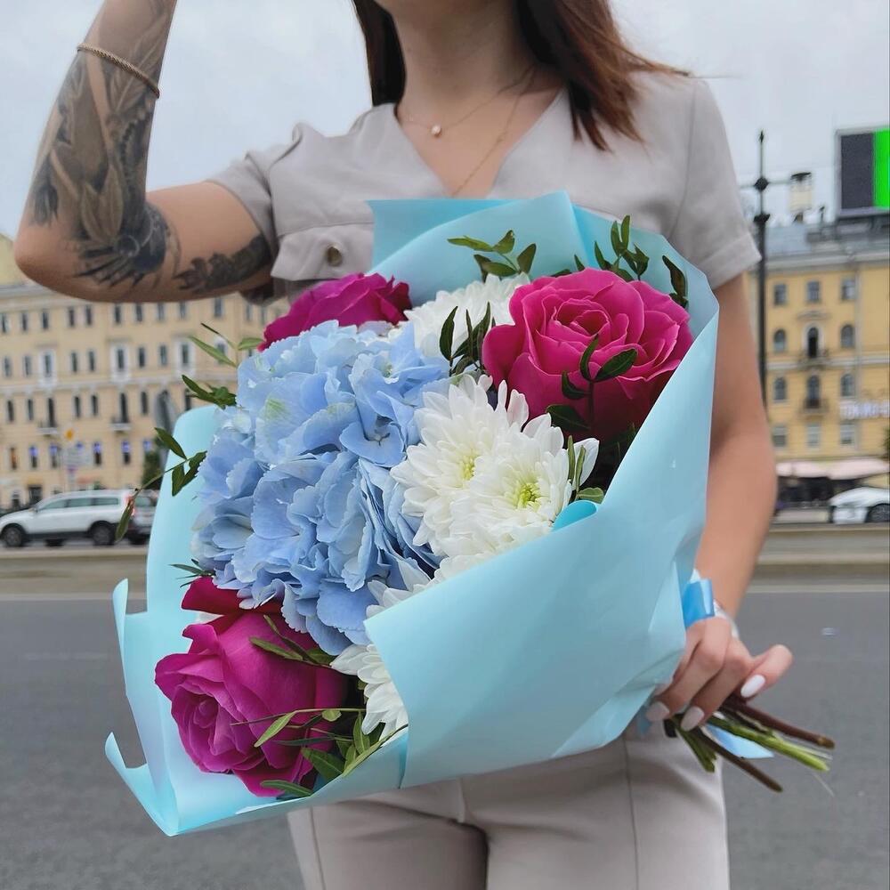 Гортензия – 1 шт.Роза – 3 шт.Хризантема кустовая – 3 шт.Фисташка пучок – 1 шт.бумага дизайнерская – 1 шт.Лента – 1 шт.