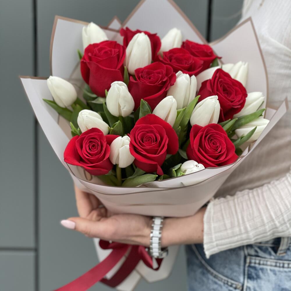 Букет Идиллия из красных роз и белых тюльпанов