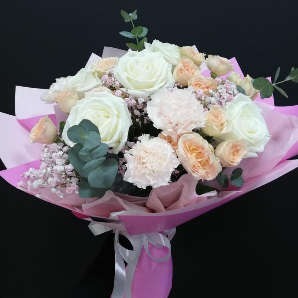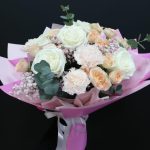 Роза кустовая – 5 шт. Эвкалипт – 3 шт. Лента атласная – 4 шт. Диантус – 3 шт. Слюда упаковка – 3 шт. салфетка декоративная – 5 шт. гипсофила радужная – 2 шт. роза плей бланка – 5 шт.