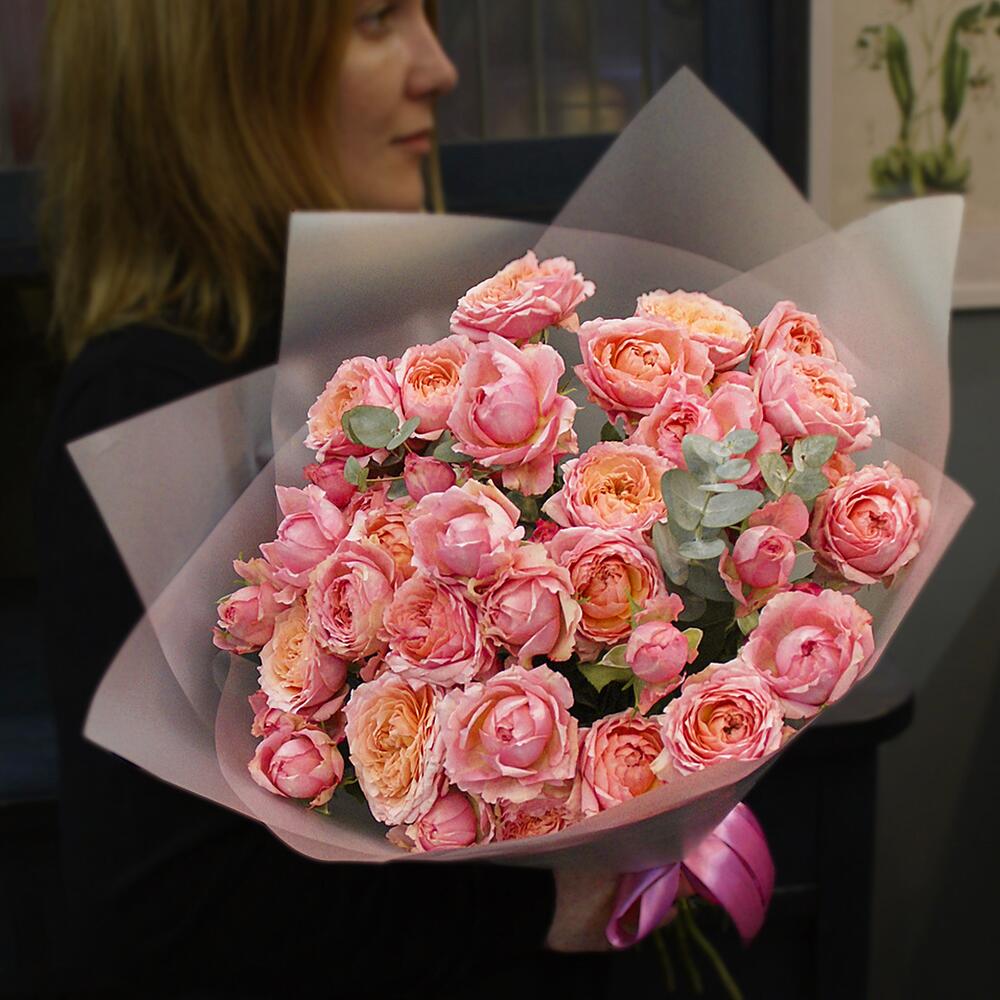 Букет из 9 кустовых пионовидных роз Джульетта с эвкалиптом