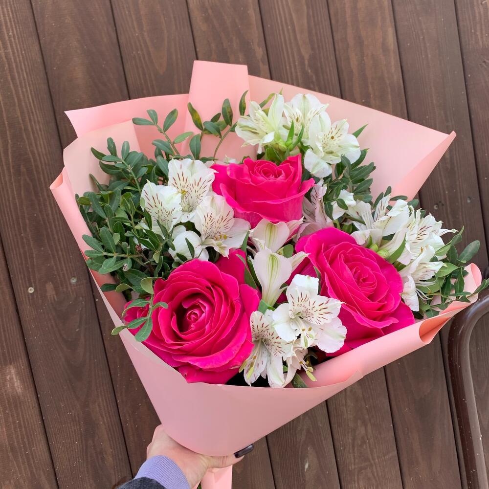 Роза Эквадор – 3 шт.Альстромерия – 5 шт.зелень декоративная – 3 шт.Упаковка дизайнерская – 2 шт.