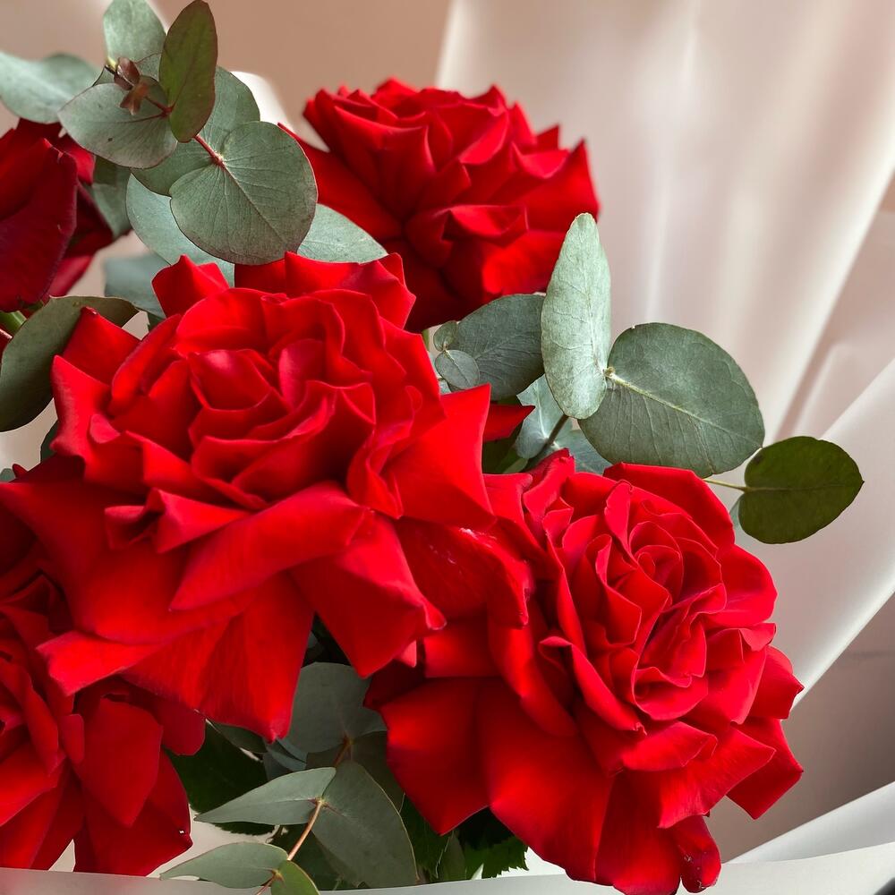 Роза красная – 5 шт.Эвкалипт – 2 шт.Лента атласная – 1 шт.Пленка матовая – 2 шт.