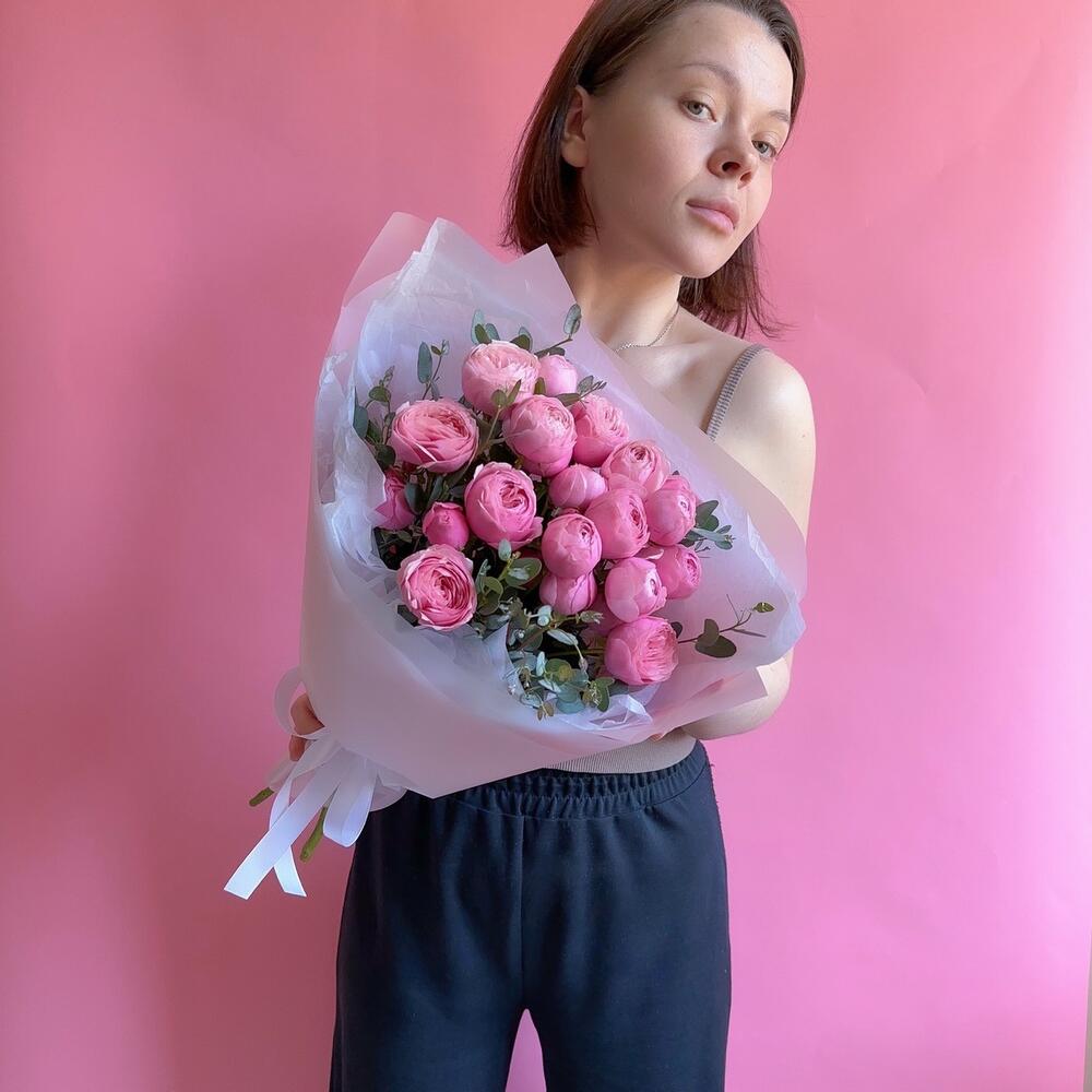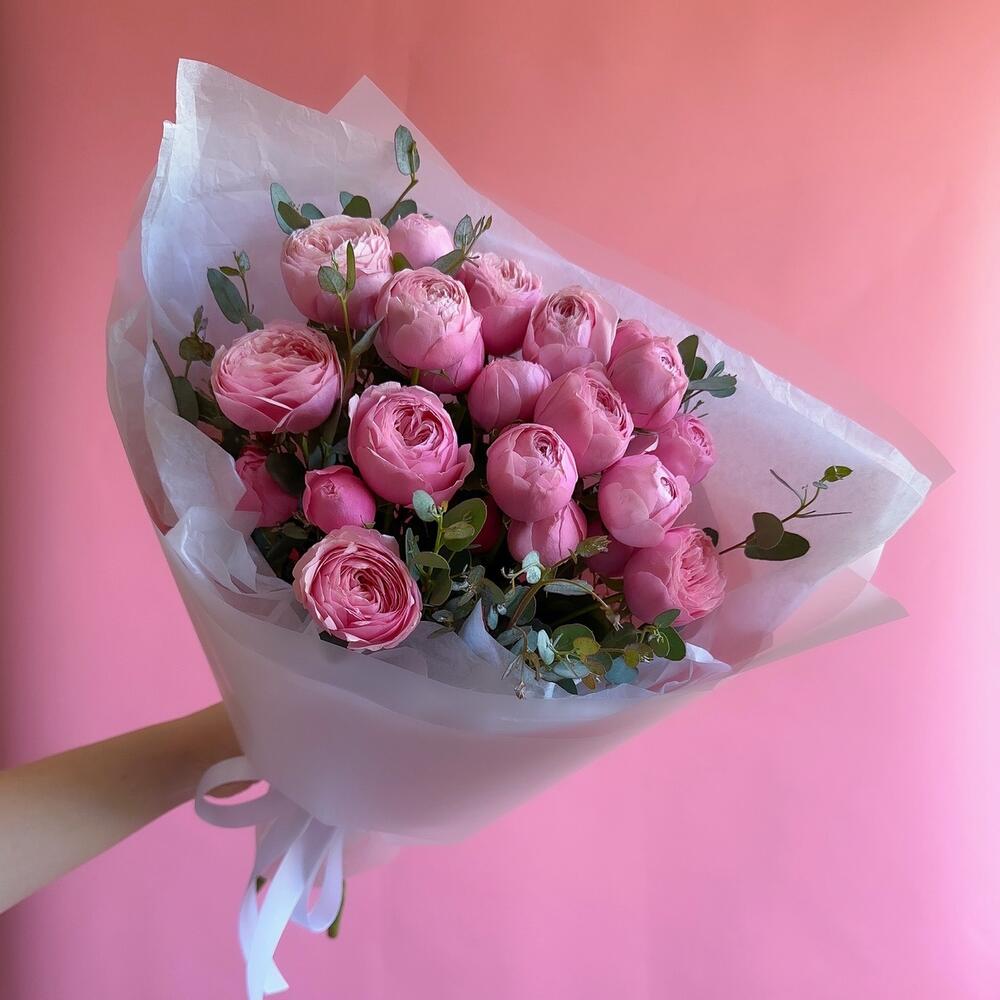 Букет из кустовой пионовидной розы и эвкалипт