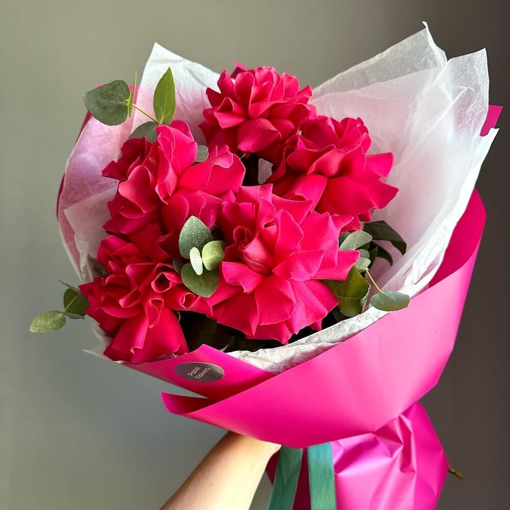 Французская роза – 5 шт. Эвкалипт – 1 шт. Упаковка дизайнерская – 1 шт.