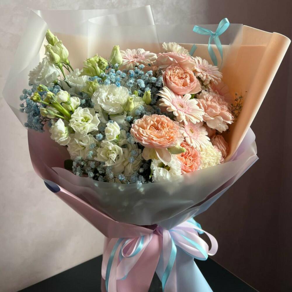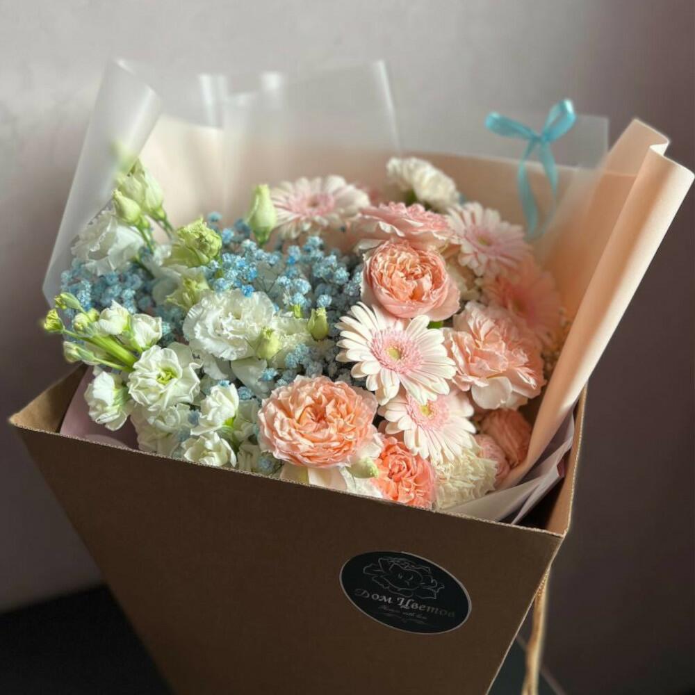 Маттиола белая – 2 шт.Гипсофила голубая – 2 шт.Лизиантус белый – 3 шт.Гербера розовая – 5 шт.пионовидная кустовая роза джульетта – 2 шт.гипсофила белая – 1 шт.Кустовая роза bombastic – 1 шт.Диантус белый – 3 шт.Дизайнерская упаковка – 3 шт.Атласная лента – 2 шт.открытка с правилами ухода за свежими цветами – 1 шт.подкормка для цветов – 1 шт.Транспортировочная коробка – 1 шт.