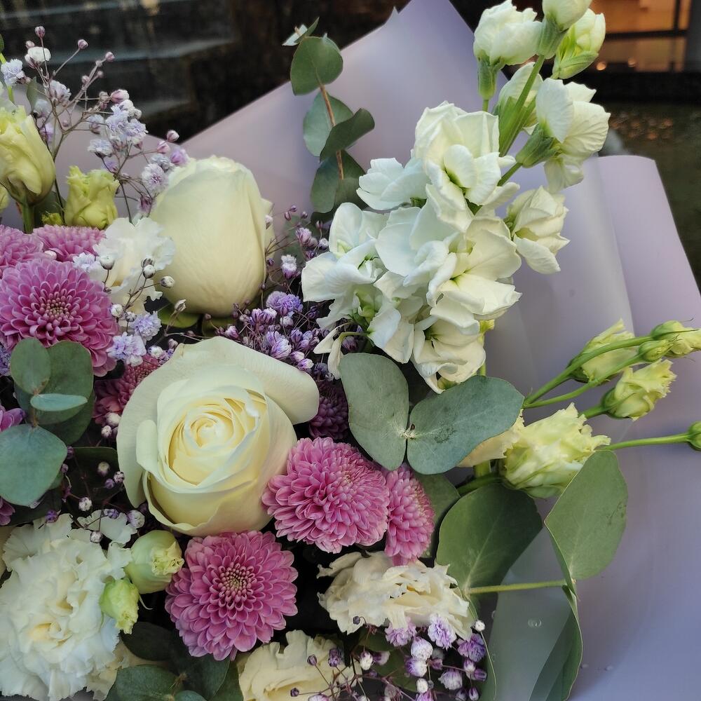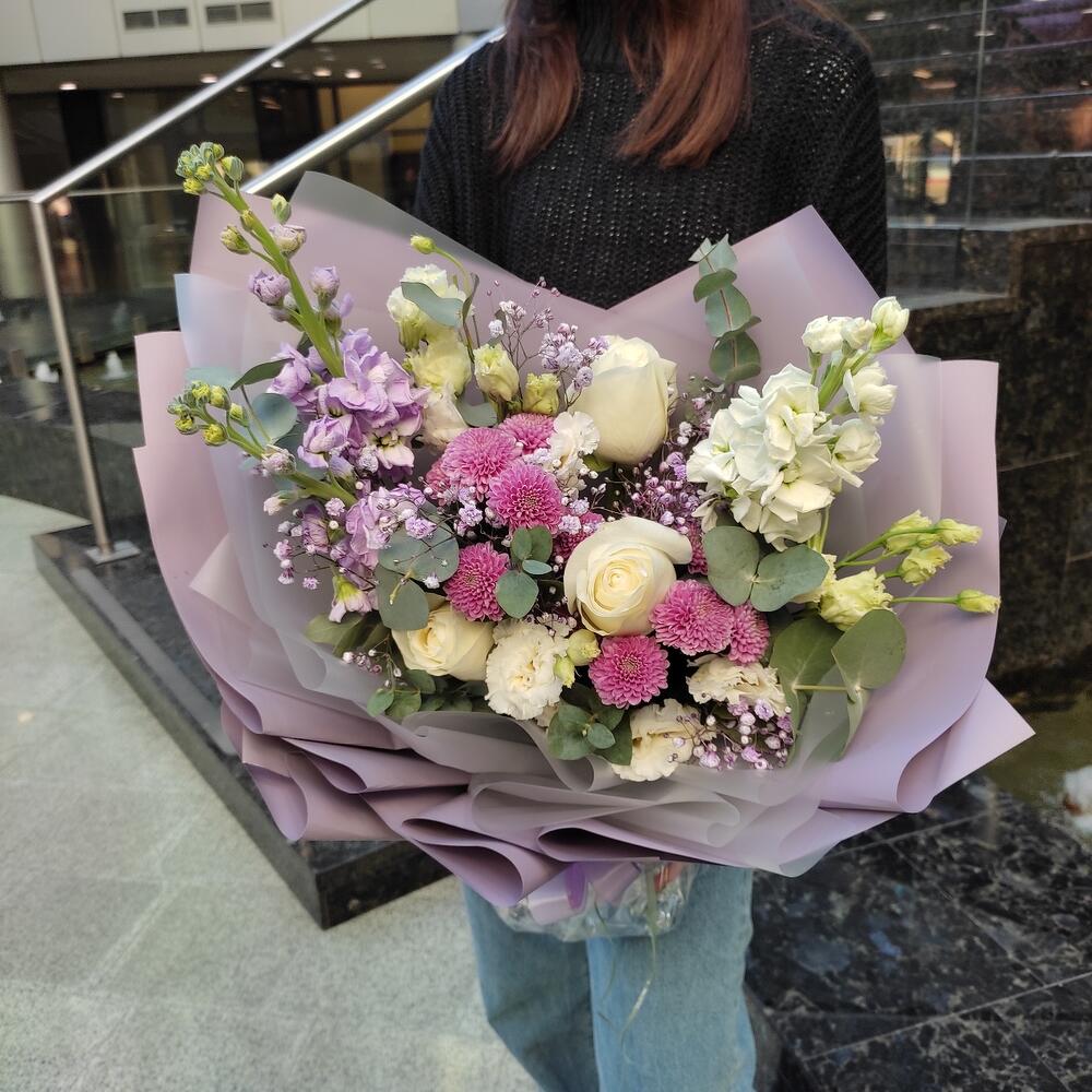 Маттиола – 3 шт.Хризантема кустовая – 2 шт.Лизиантус – 2 шт.Роза – 1 шт.Гипсофила – 1 шт.Эвкалипт – 1 шт.Лента – 2 шт.Упаковка дизайнерская – 2 шт.