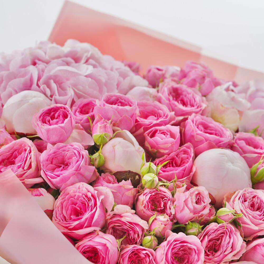 Пионовидная роза кустовая – 11 шт.пионы – 9 шт.гортензия розовая большая – 9 шт.Лента атласная – 2 шт.Упаковка дизайнерская – 2 шт.Кризал – 1 шт.инструкция по уходу за цветами – 1 шт.коробка переноска – 1 шт.