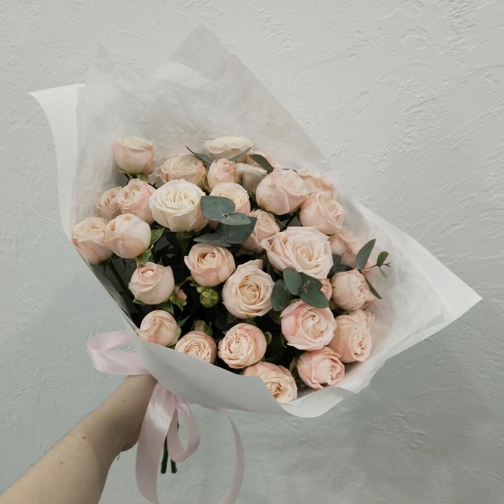 Букет из пионовидной кустовой розы и эвкалипт