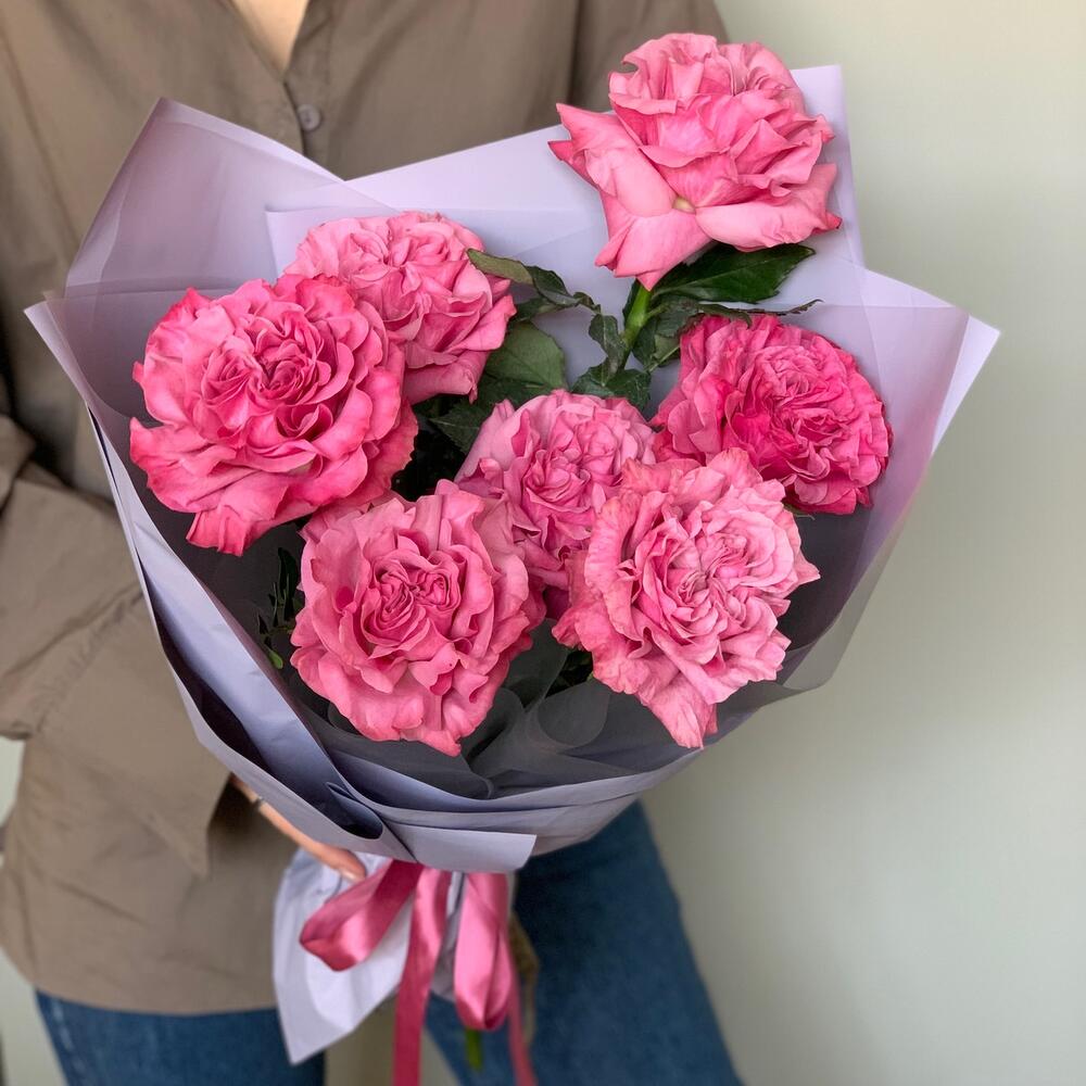 Роза пионовидная – 7 шт.Фисташка – 4 шт.Упаковка дизайнерская – 2 шт.Лента атласная – 1 шт.