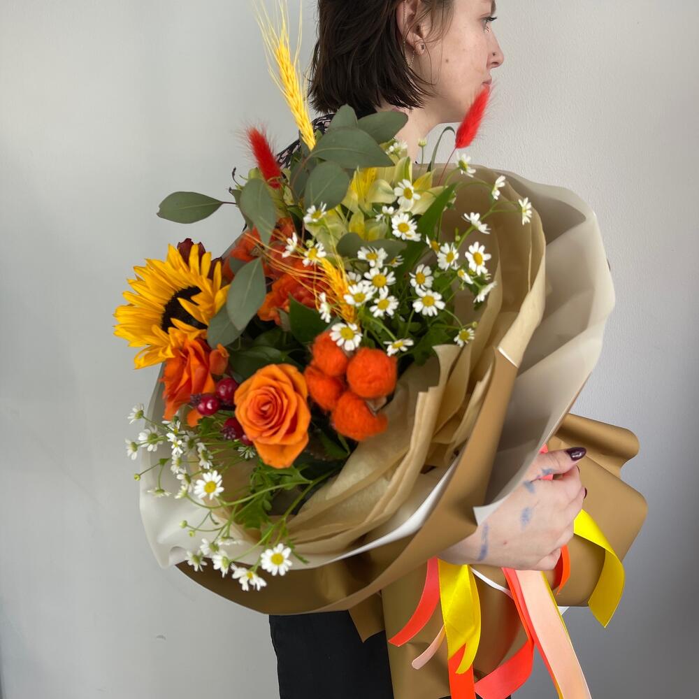 Альстромерия – 2 шт.Эвкалипт – 1 шт.Лента атласная – 2 шт.Роза Россия – 5 шт.Подсолнух – 1 шт.Рускус сочи – 5 шт.Пленка матовая – 4 шт.Хлопок натуральный – 2 шт.Лагурус (сухоцвет) – 3 шт.колосок полевой – 1 шт.ромашки кустовые – 2 шт.