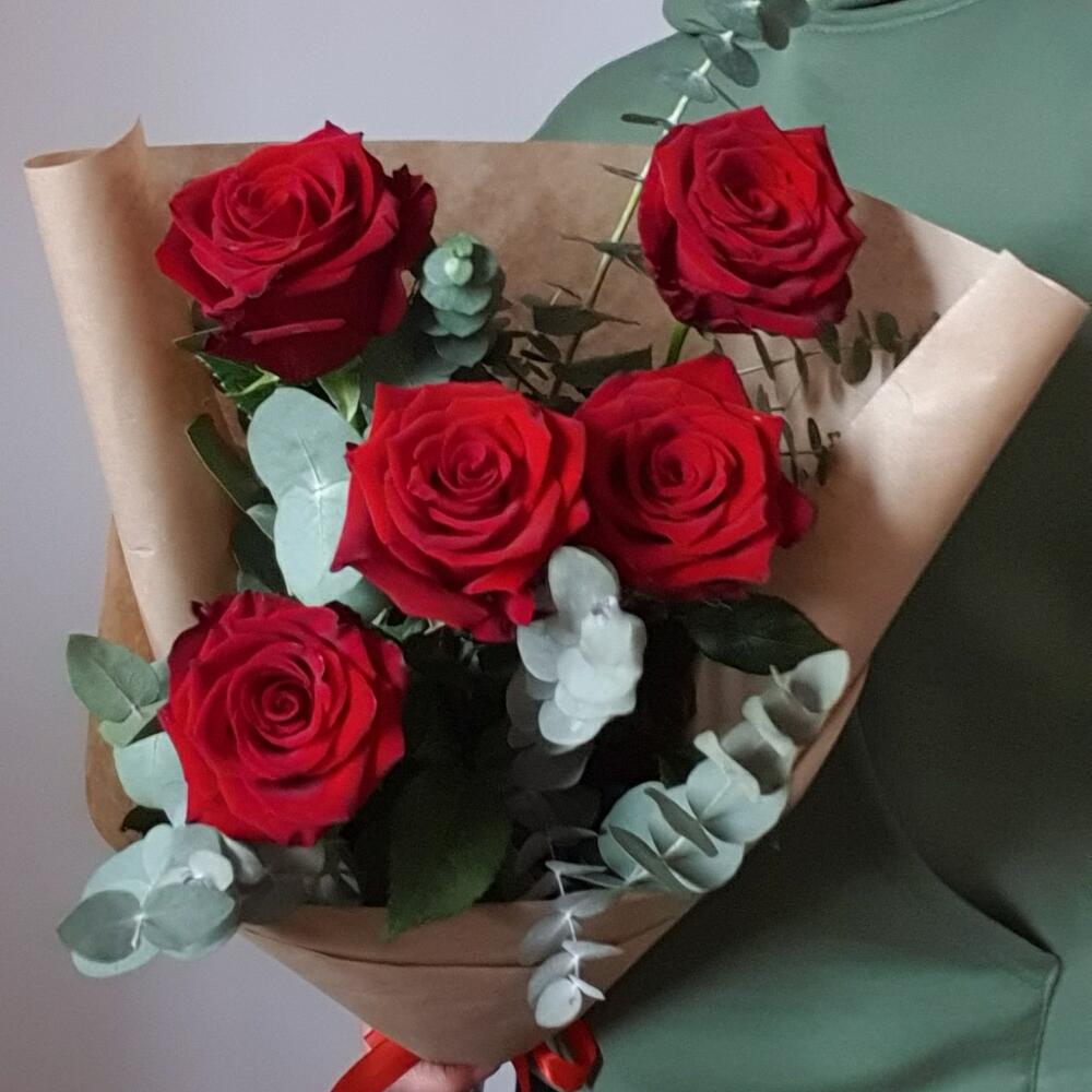 Эвкалипт – 5 шт.Упаковка – 2 шт.Лента атласная – 1 шт.Роза Эксплорер – 5 шт.