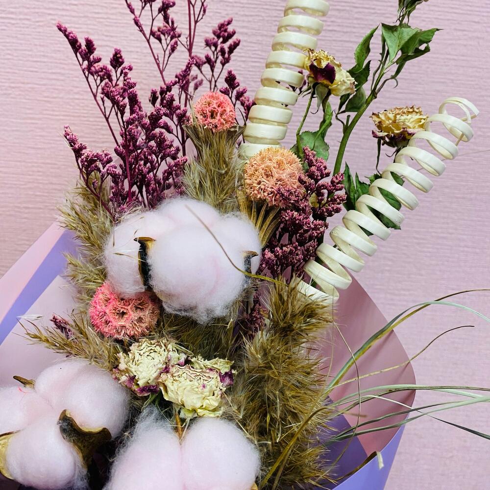Скабиоза – 1 шт.Упаковка – 1 шт.Ковыль – 2 шт.Роза сухоцвет – 2 шт.Хлопок натуральный – 3 шт.Завиток – 2 шт.лимониум стабилизированный – 1 шт.