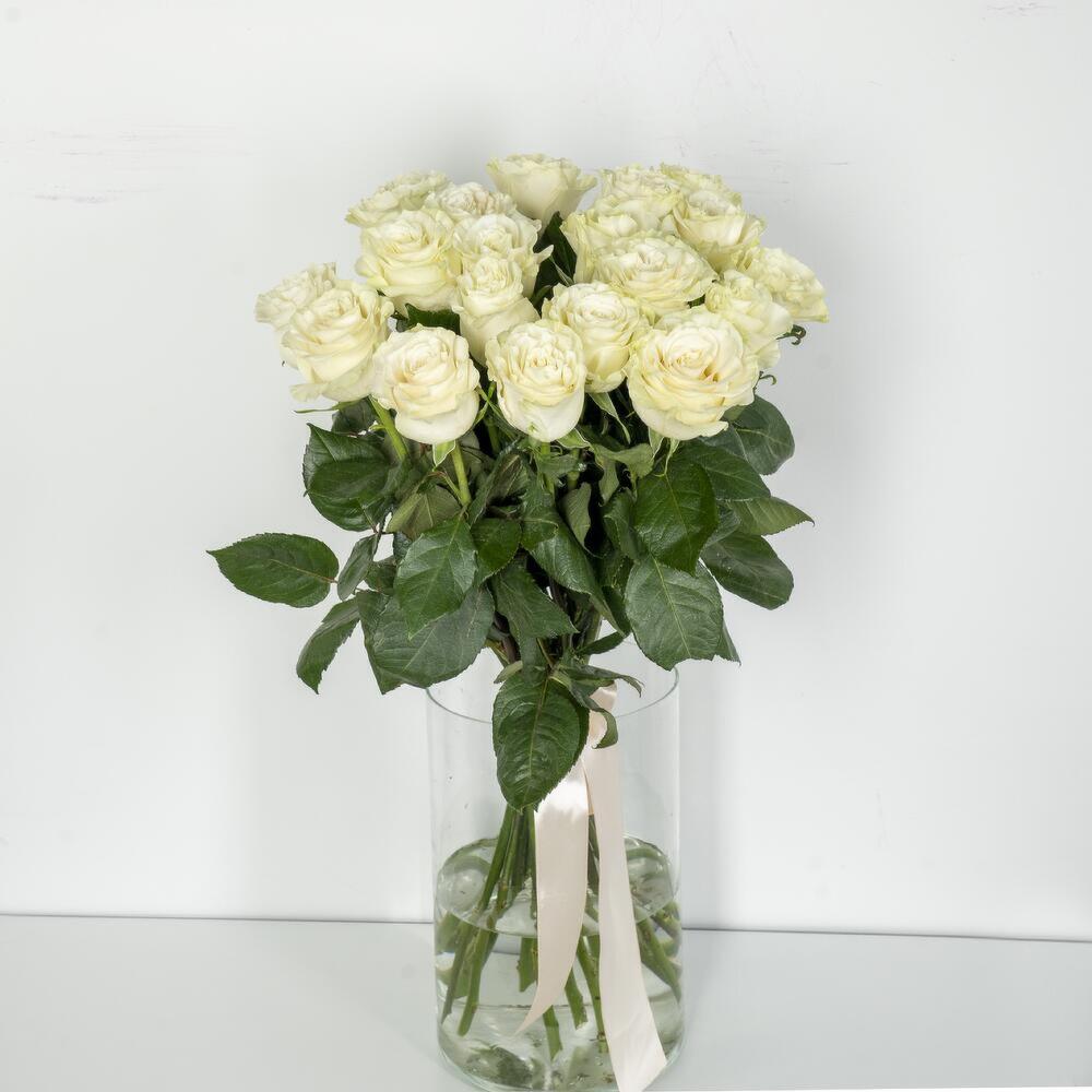белая сортовая роза – 19 шт. Атласная лента – 1 шт. Открыточка с вашими пожеланиями – 1 шт.