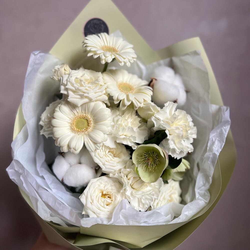 Гербера – 3 шт.Кустовая роза – 2 шт.Хелеборус – 1 шт.Гвоздика – 2 шт.Сухоцветы – 3 шт.декоративная упаковка – 1 шт.Атласная лента – 1 шт.