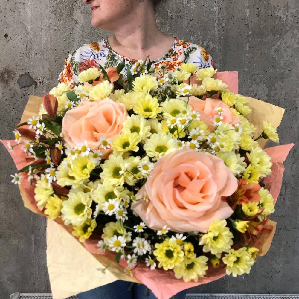 Хризантема кустовая – 8 шт.Роза – 3 шт.Альстромерия – 3 шт.Мантрикария – 5 шт.Крафт – 3 шт.Атласная лента – 1 шт.