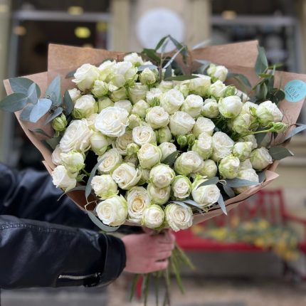 Кустовая роза – 10 шт. Упаковка – 1 шт. Атласная лента – 1 шт.