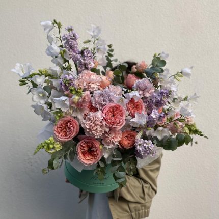 сортовые розы – 9 шт. ранункулусы – 2 шт. пионовидные спрей роза – 5 шт. колольчик – 5 шт. Эвкалипт – 3 шт.