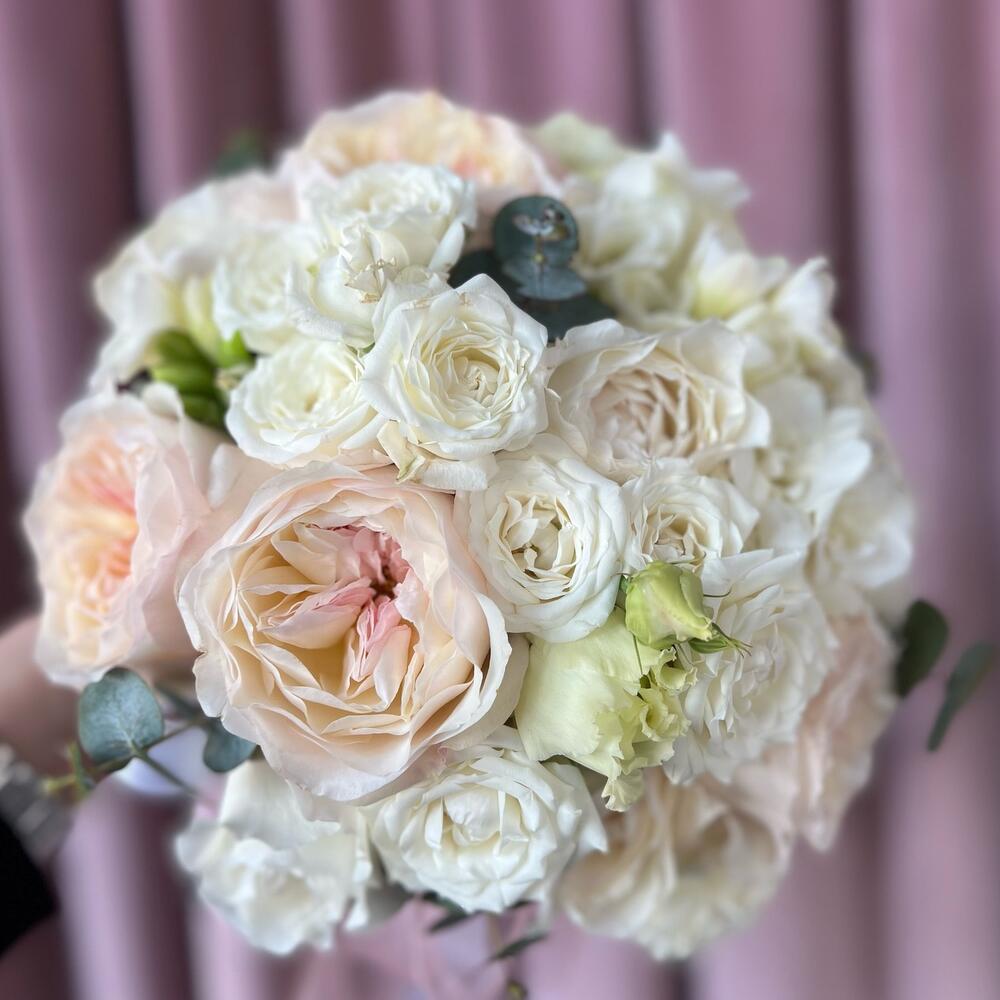 Лизиантус – 3 шт.Фрезия – 5 шт.Эвкалипт – 3 шт.Пионовидная роза – 7 шт.Атласная лента – 3 шт.Кустовая пионовидная роза – 6 шт.