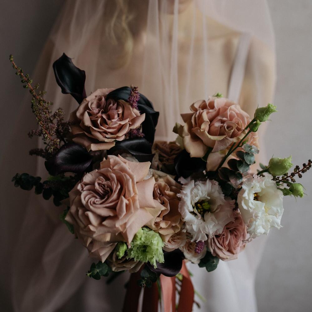 Астильба – 5 шт.Калла – 7 шт.Лизиантус – 1 шт.Эвкалипт – 5 шт.Пионовидная роза – 9 шт.Атласная лента – 2 шт.Кустовая пионовидная роза – 3 шт.