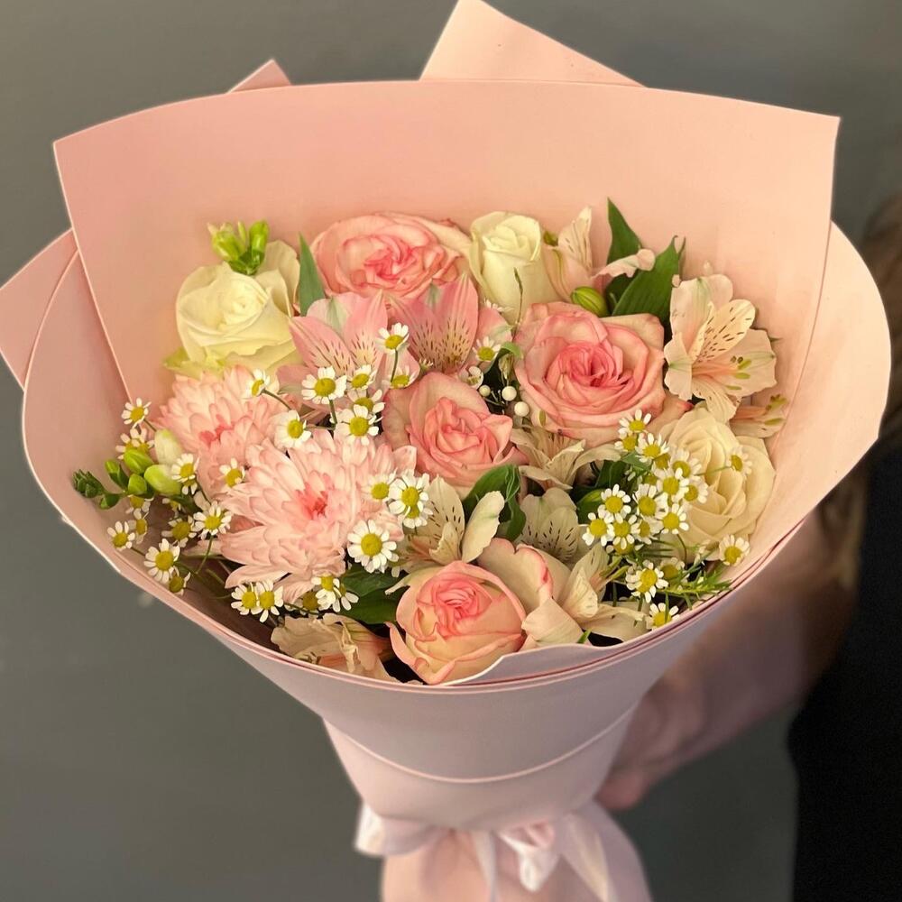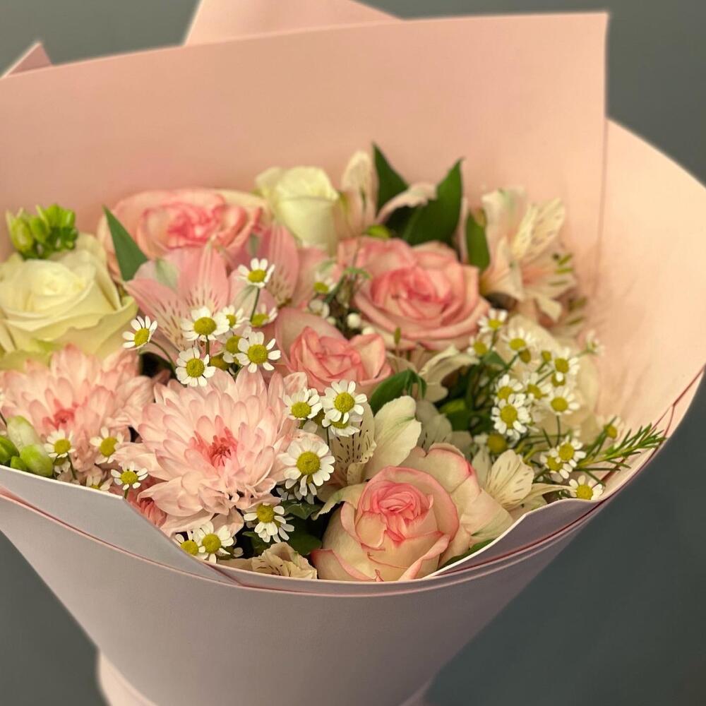 Роза – 5 шт.Альстромерия – 3 шт.хризантема куст – 2 шт.ромашки кустовые – 3 шт.Стильная упаковка – 4 шт.Лента атласная – 1 шт.работа флориста – 1 шт.