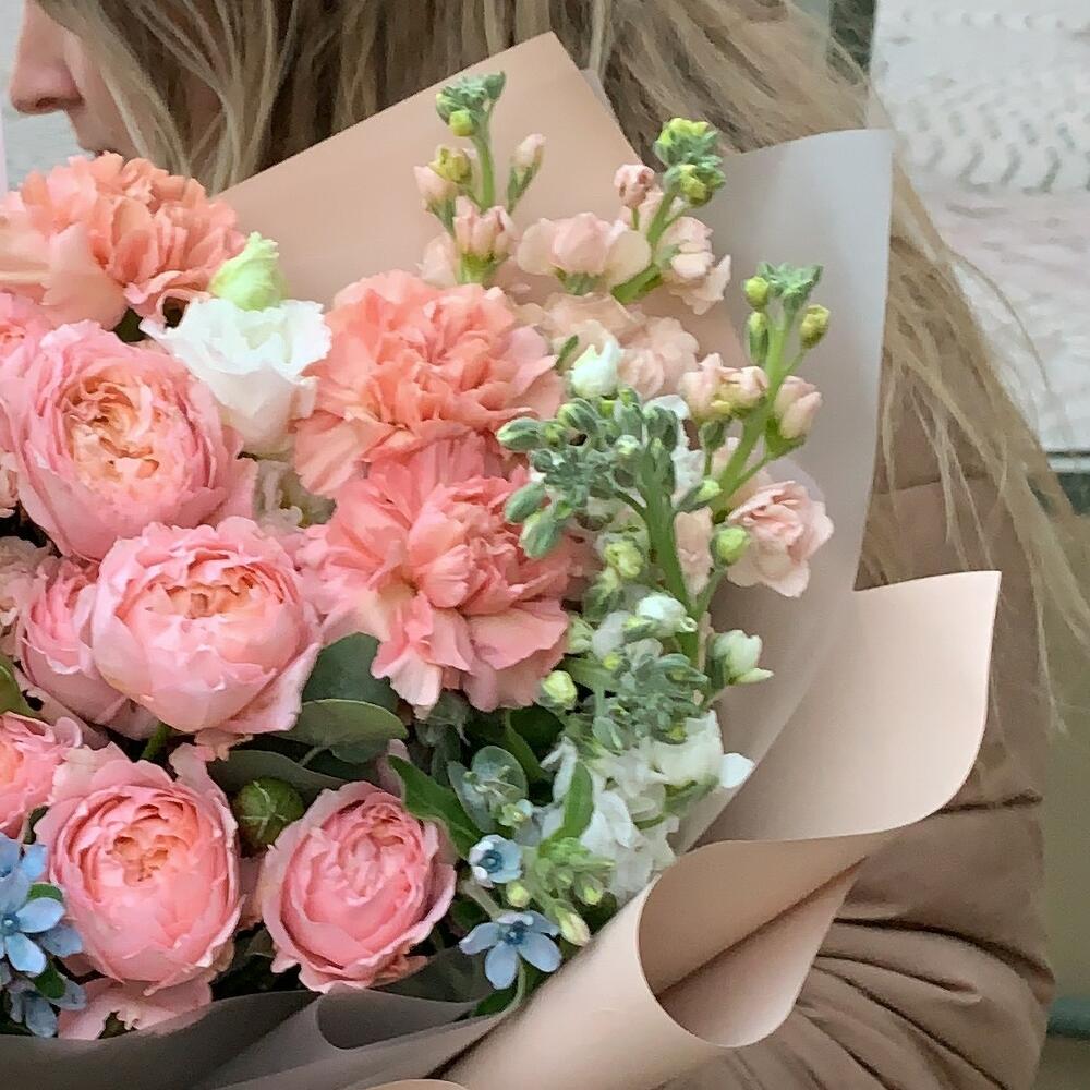 Роза пионовидная кустовая – 3 шт.Оксипеталум – 2 шт.Маттиола – 7 шт.Диантус – 5 шт.Лизиантус – 1 шт.Упаковка – 2 шт.Лента – 2 шт.