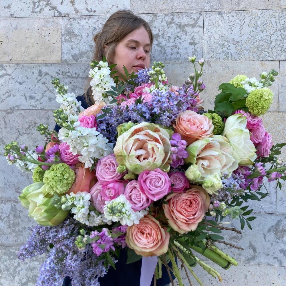 амариллисы – 3 шт.Роза пионовидная – 13 шт.Маттиола – 15 шт.Сирень – 5 шт.Вибурнум – 3 шт.Лента – 1 шт.