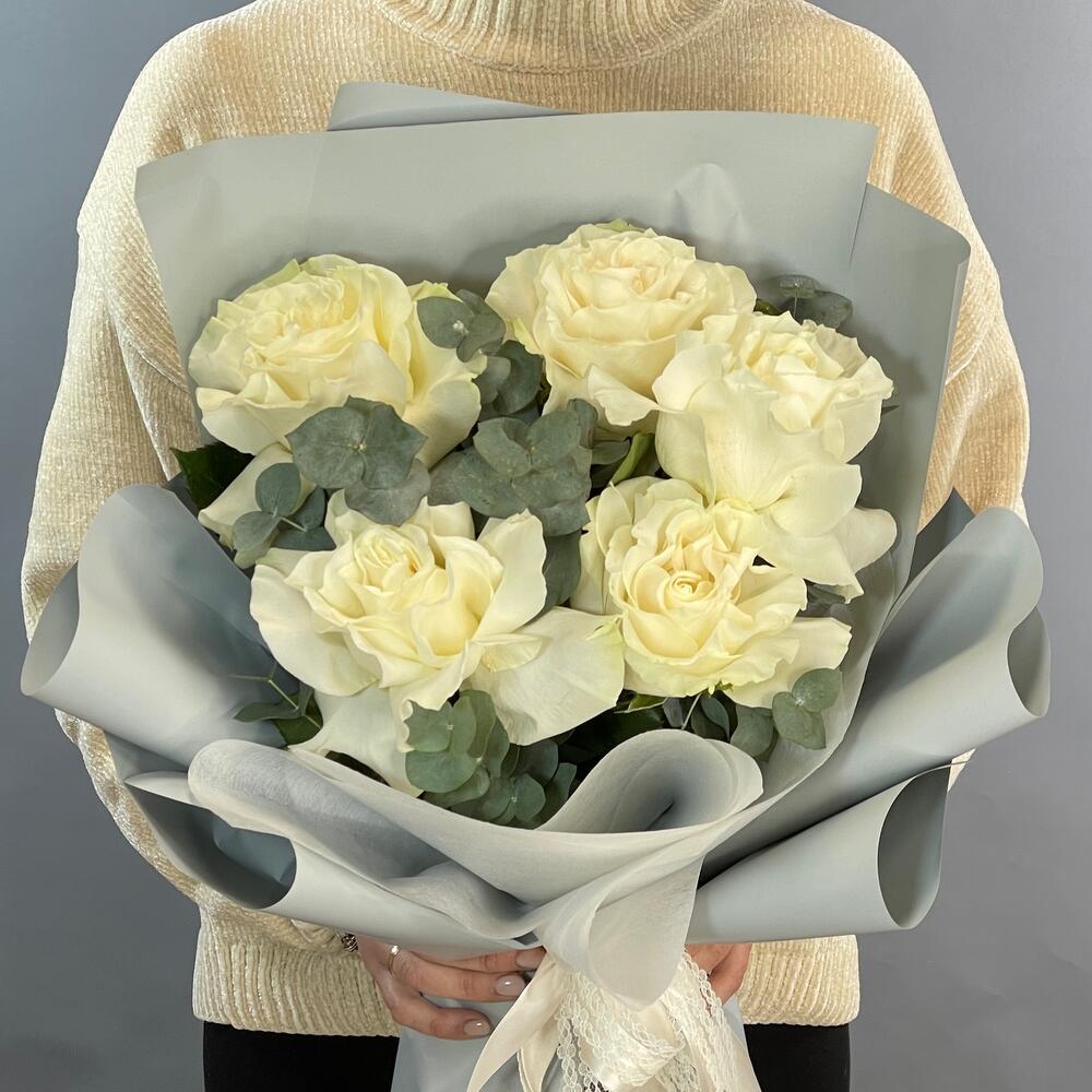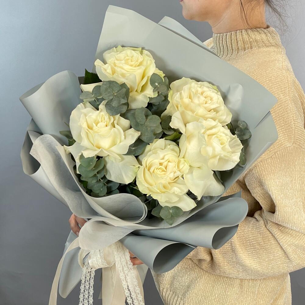 Роза одноголовая – 5 шт.Эвкалипт – 2 шт.Упаковка дизайнерская – 2 шт.Лента – 2 шт.