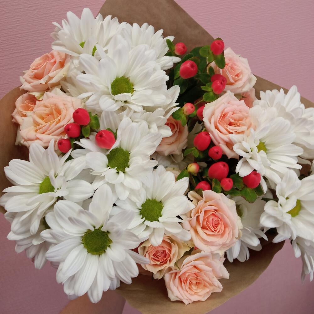 Гиперикум – 3 шт.Лента – 1 шт.Роза кустовая – 3 шт.Хризантема кустовая – 3 шт.Упаковка – 1 шт.зелень декоративная – 2 шт.