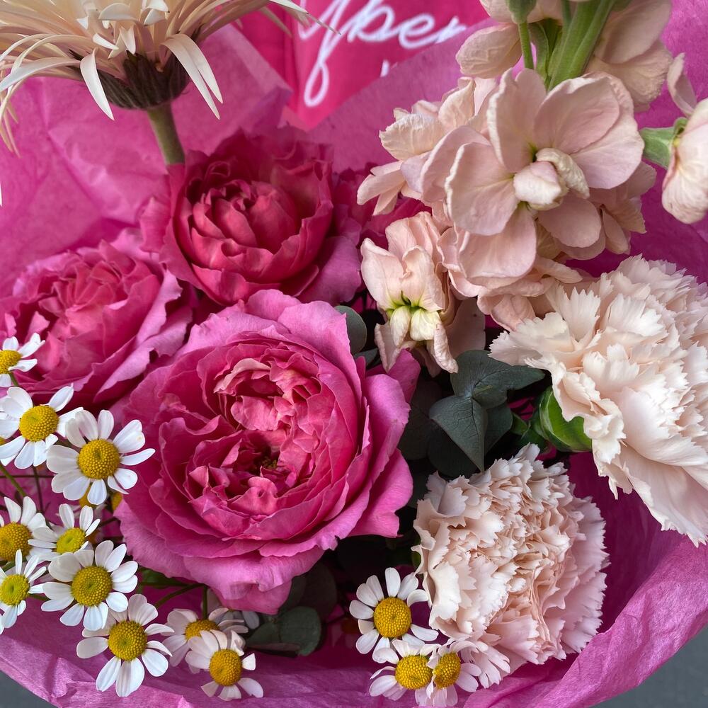 гербера махровая – 1 шт.Диантус – 2 шт.Роза кустовая пионовидная – 1 шт.Матрикария – 2 шт.Эвкалипт – 2 шт.Упаковка дизайнерская – 1 шт.