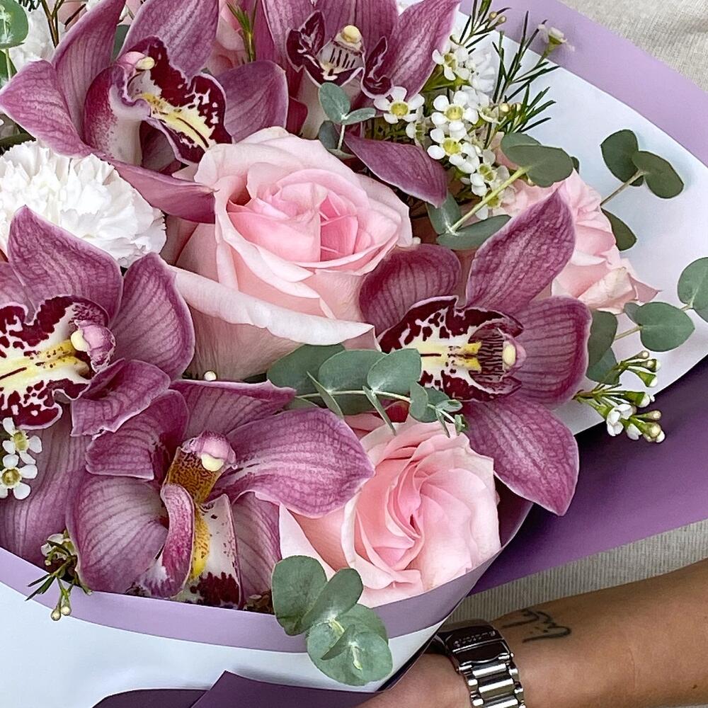 орхидея – 5 шт.Роза розовая – 3 шт.Ваксфлауэр – 1 шт.Гвоздика – 3 шт.Эвкалипт – 2 шт.Упаковка дизайнерская – 1 шт.