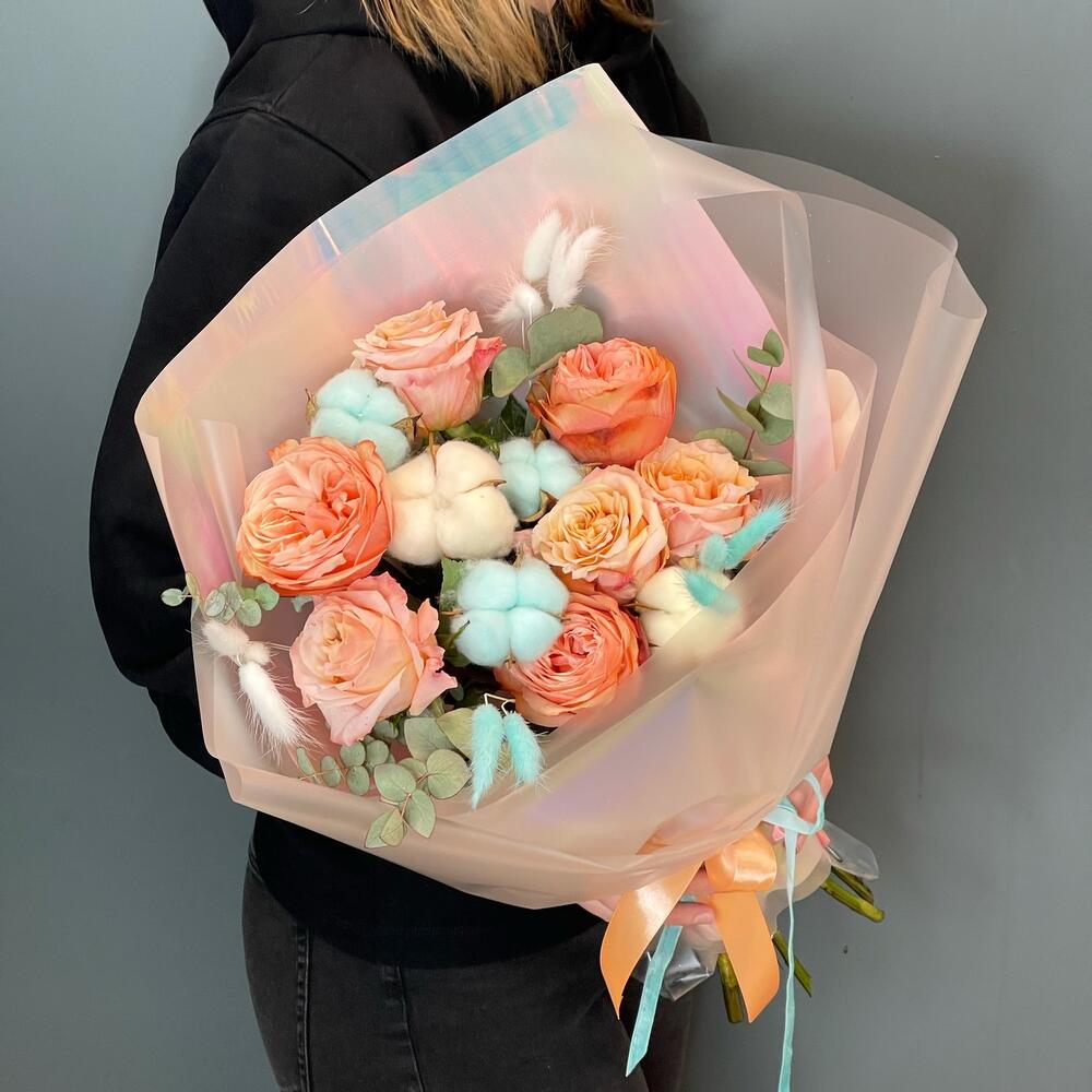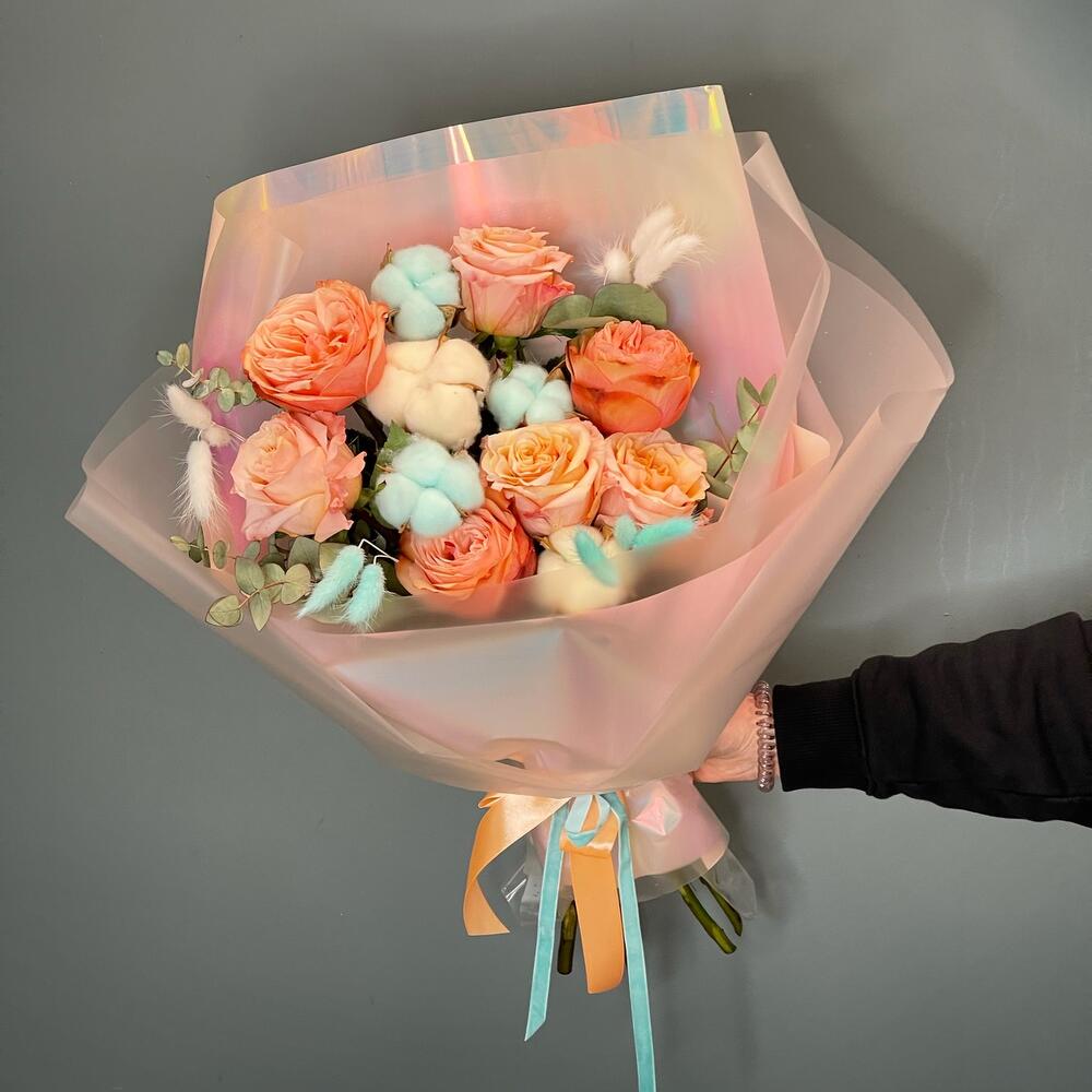 Лента – 1 шт.Хлопок – 7 шт.Эвкалипт – 1 шт.Роза одноголовая – 7 шт.Упаковка дизайнерская – 1 шт.Лагурус – 12 шт.