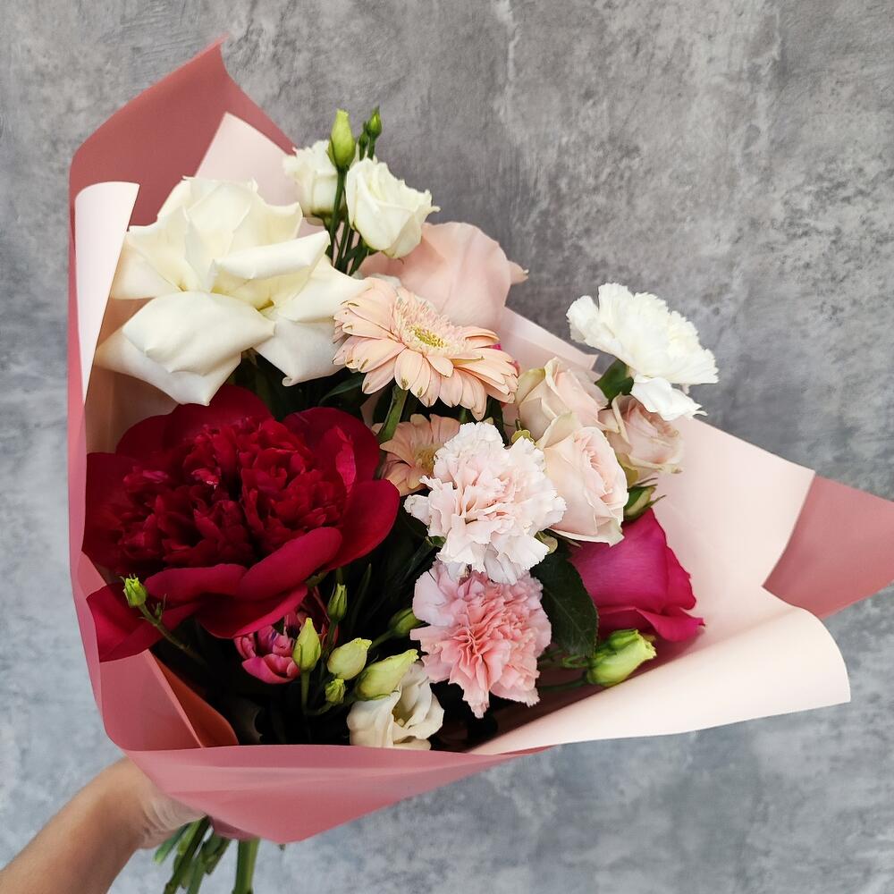 Роза кустовая – 1 шт.Гербера – 2 шт.Атласная лента – 1 шт.Тюльпан пионовидный – 2 шт.Роза Pink Floyd – 1 шт.эустома белая – 1 шт.Авторская упаковка – 1 шт.роза плая бланка – 1 шт.гвоздика диантус – 3 шт.пион диана паркс – 1 шт.роза амороса – 1 шт.