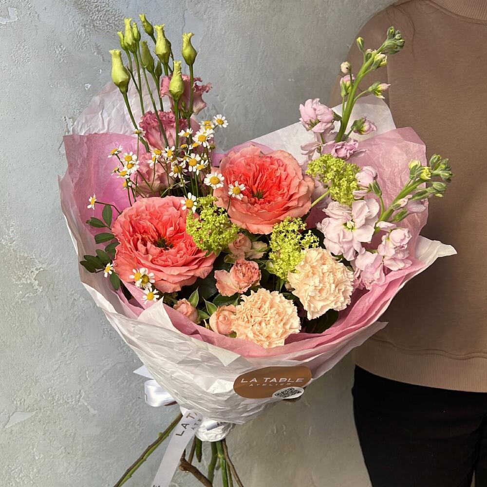 Матрикария (Ромашка Камила) – 1 шт.Роза пионовидная – 2 шт.Диантус – 2 шт.Роза кустовая пионовидная – 1 шт.Лизиантус – 1 шт.Маттиола – 2 шт.Упаковка дизайнерская – 1 шт.