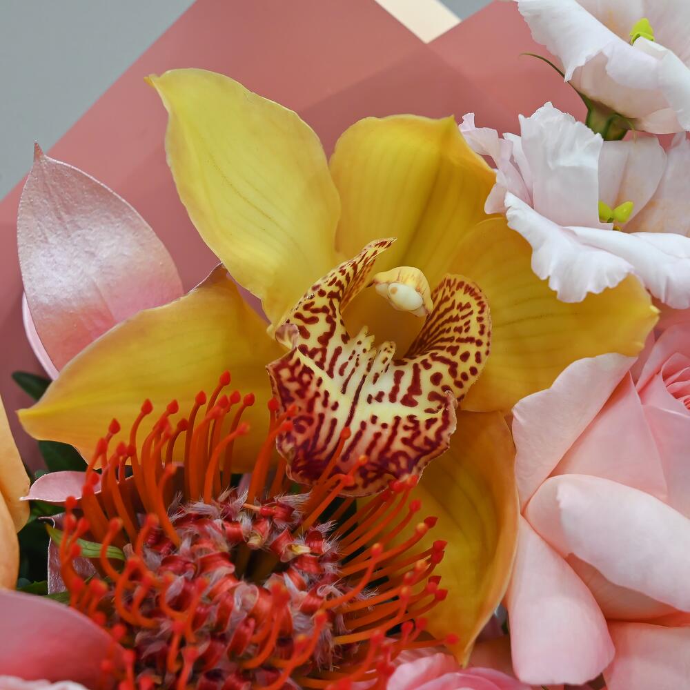 Букет с пионовидными французскими розами и орхидеей