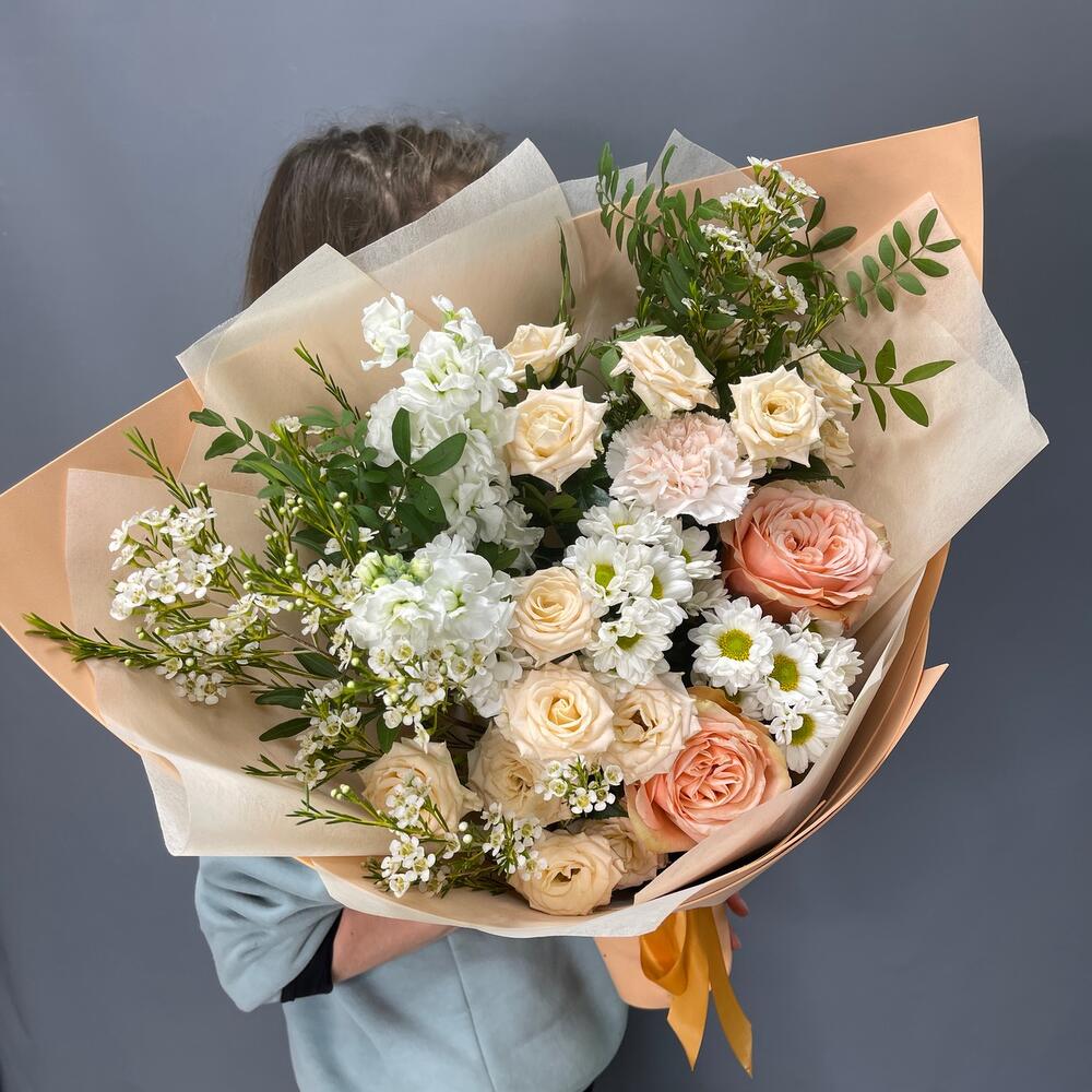 Маттиола – 2 шт.Гвоздика – 2 шт.Лента атласная – 1 шт.Сантини – 2 шт.Фисташка – 2 шт.Упаковка дизайнерская – 1 шт.Ваксфлауэр белый – 2 шт.кахала роза – 2 шт.таня кустовая роза – 4 шт.