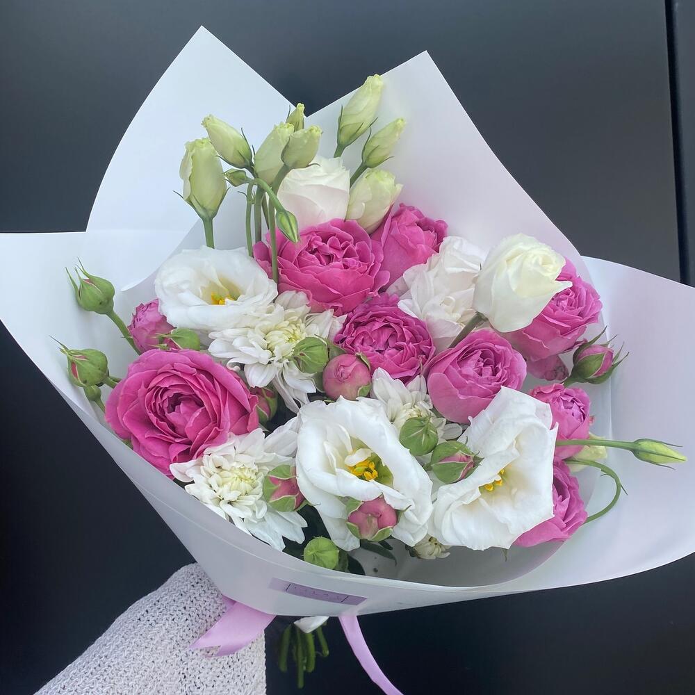 Упаковка дизайнерская – 1 шт. Открыточка с вашими пожеланиями – 1 шт. эустома белая – 3 шт. Misty Bubbles пионовидная роза – 5 шт.