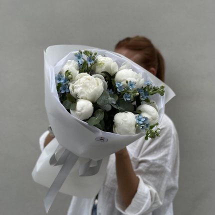 Пион местный – 3 шт. Роза – 5 шт. Эвкалипт – 2 шт. Колокольчик – 4 шт. Ромашка – 2 шт.