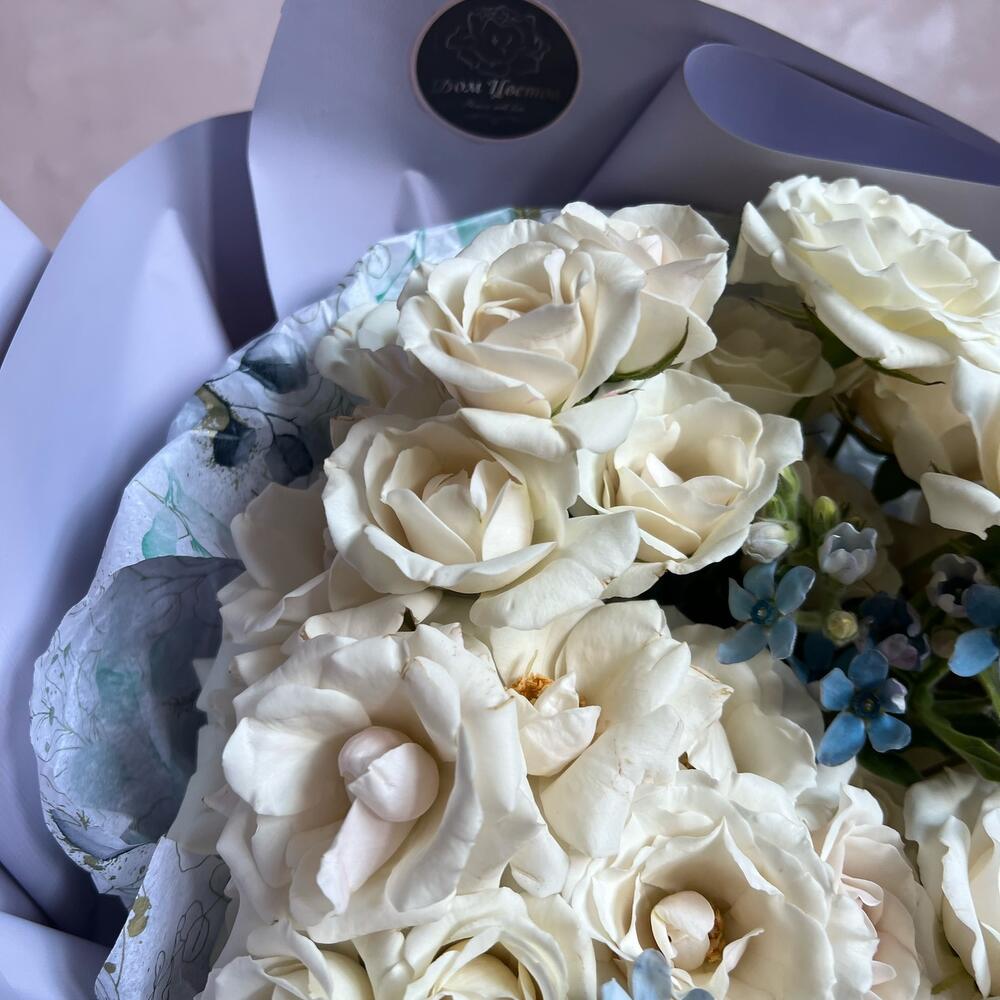 Кустовая белая роза – 13 шт.Оксипеталум – 5 шт.декоративная упаковка – 1 шт.Атласная лента – 1 шт.