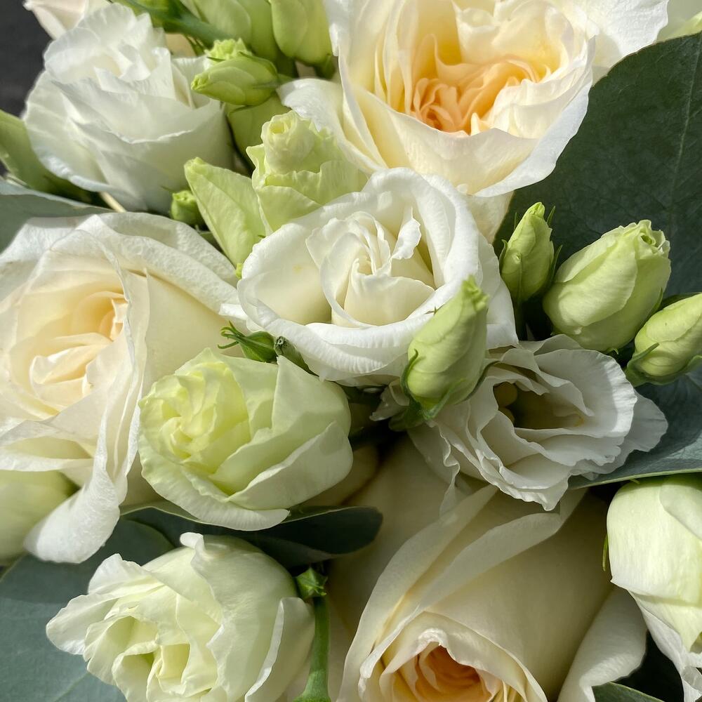 Лента атласная – 1 шт.Лизиантус белый – 7 шт.Эвкалипт пучок – 1 шт.роза канделайт – 11 шт.