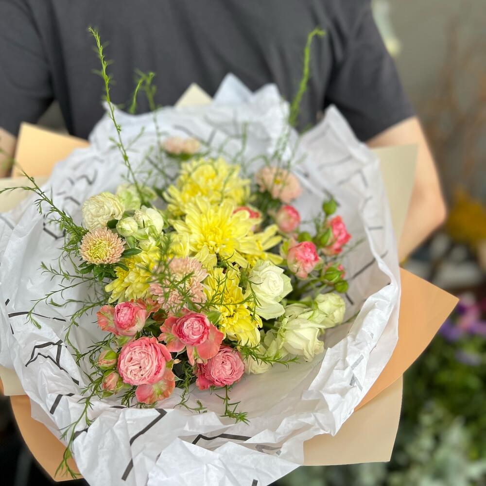 Хризантема – 5 шт. Кустовая роза – 3 шт. Зелень – 3 шт.