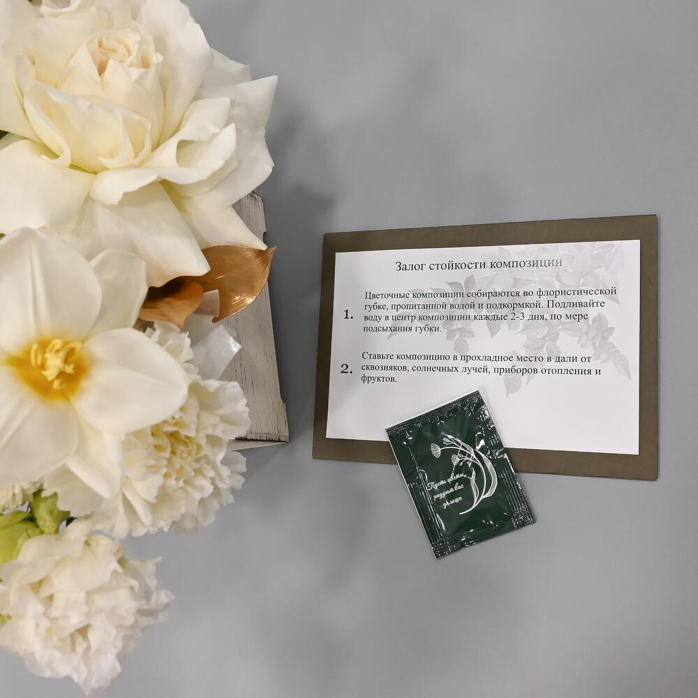 Французская роза – 1 шт.Тюльпан – 1 шт.Эустома – 2 шт.Гвоздика – 4 шт.Сантини – 2 шт.Рускус – 2 шт.Лист пальмы – 1 шт.Тишью – 1 шт.Ящик деревянный – 1 шт.