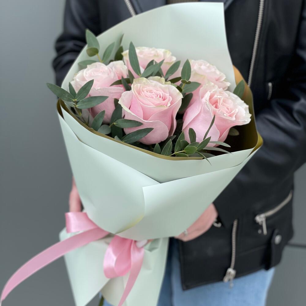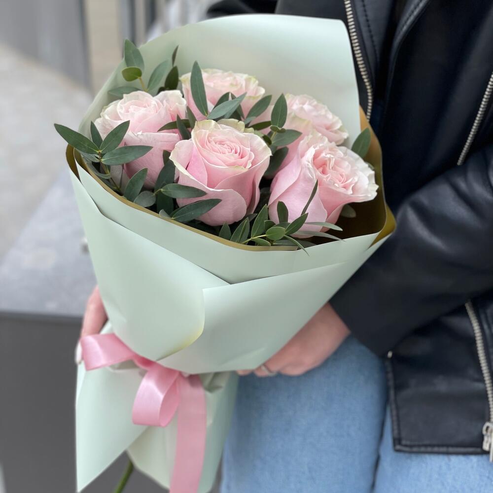 Роза пинк мондиаль – 5 шт. Эвкалипт – 1 шт. Писташ – 2 шт. Оформление – 1 шт.