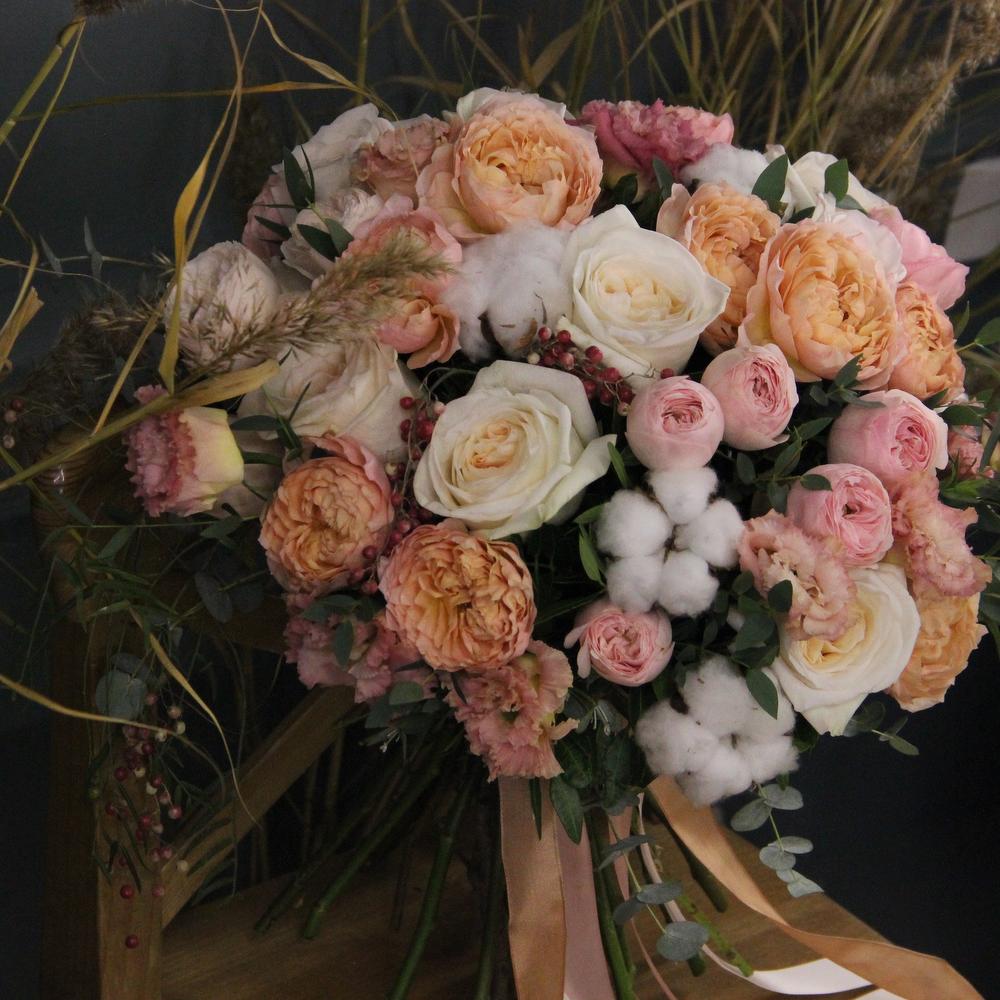 Роза пионовидная кустовая – 9 шт.Роза пионовидная – 7 шт.Лизиантус – 7 шт.хлопок коробка – 7 шт.Эвкалипт – 9 шт.Фисташка – 5 шт.Лента атласная – 2 шт.