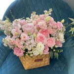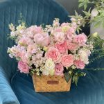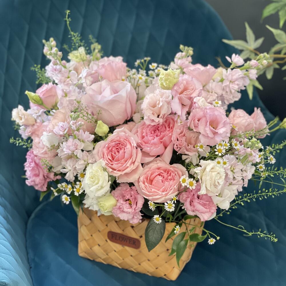 Лизиантус – 5 шт.Роза одноголовая – 5 шт.Роза пионовидная кустовая – 3 шт.Матрикария – 2 шт.Корзина плетеная – 1 шт.Маттиола белая – 8 шт.Оазис флористический – 1 шт.